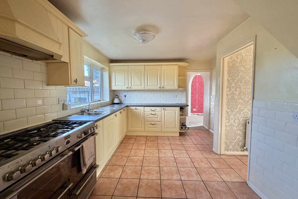 with tiled flooring, a selection of high and low level kitchen cabinets, laminate worktops, Stoves freestanding oven with 7 ring gas hob and extractor fan over, one and a half bowl stainless steel sink, uPVC double glazed window overlooking rear garden, integrated dishwasher, localised tiling