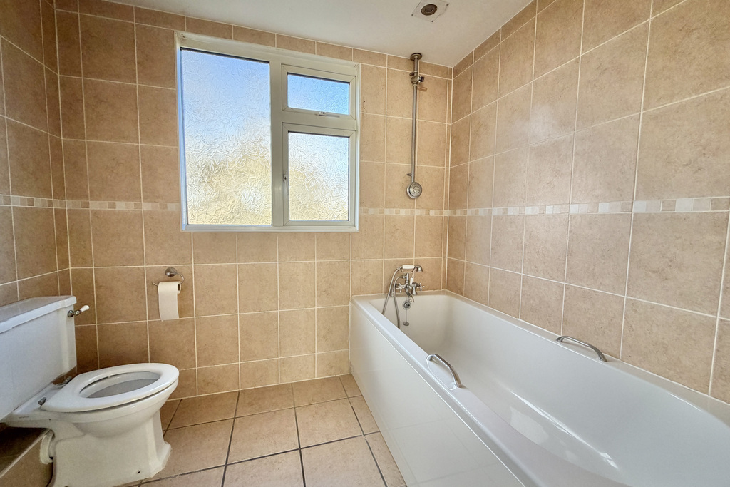 with floor to ceiling tiling, panelled bath with mixer tap over and separate hand attachment, WC, hand basin with mixer tap over, towel radiator, uPVC double glazed frosted window