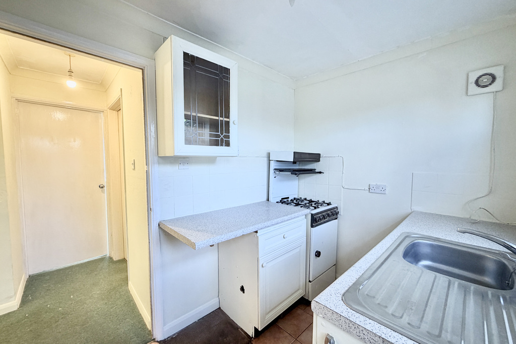 with tiled flooring, selection of high and low level cabinets, laminate worktops, one bowl stainless steel sink with mixer tap over, space for two undercounter appliances, freestanding gas over with four ring gas hob, uPVC double glazed window overlooking rear with uPVC double glazed frosted door to side leading to rear garden, radiator