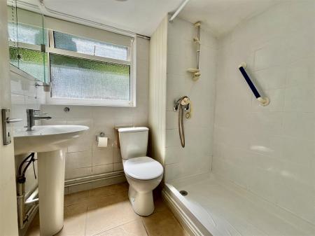 Shower Room - 1.96m x 1.68m (6'05 x 5'06) - Walk-in gravity fed shower cubicle with tiled surround, low level w.c, pedestal washbasin, radiator, tiled walls and floor, obscured side aspect window.