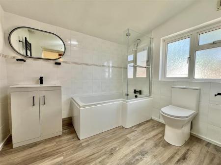 En-Suite Bathroom - 2.67m x 2.18m (8'09 x 7'02) - Recently refitted three piece suite comprising a bath with electric shower over, low level w.c and vanity washbasin unit, heated towel rail, partly tiled walls, vinyl flooring, obscured side aspect window.
