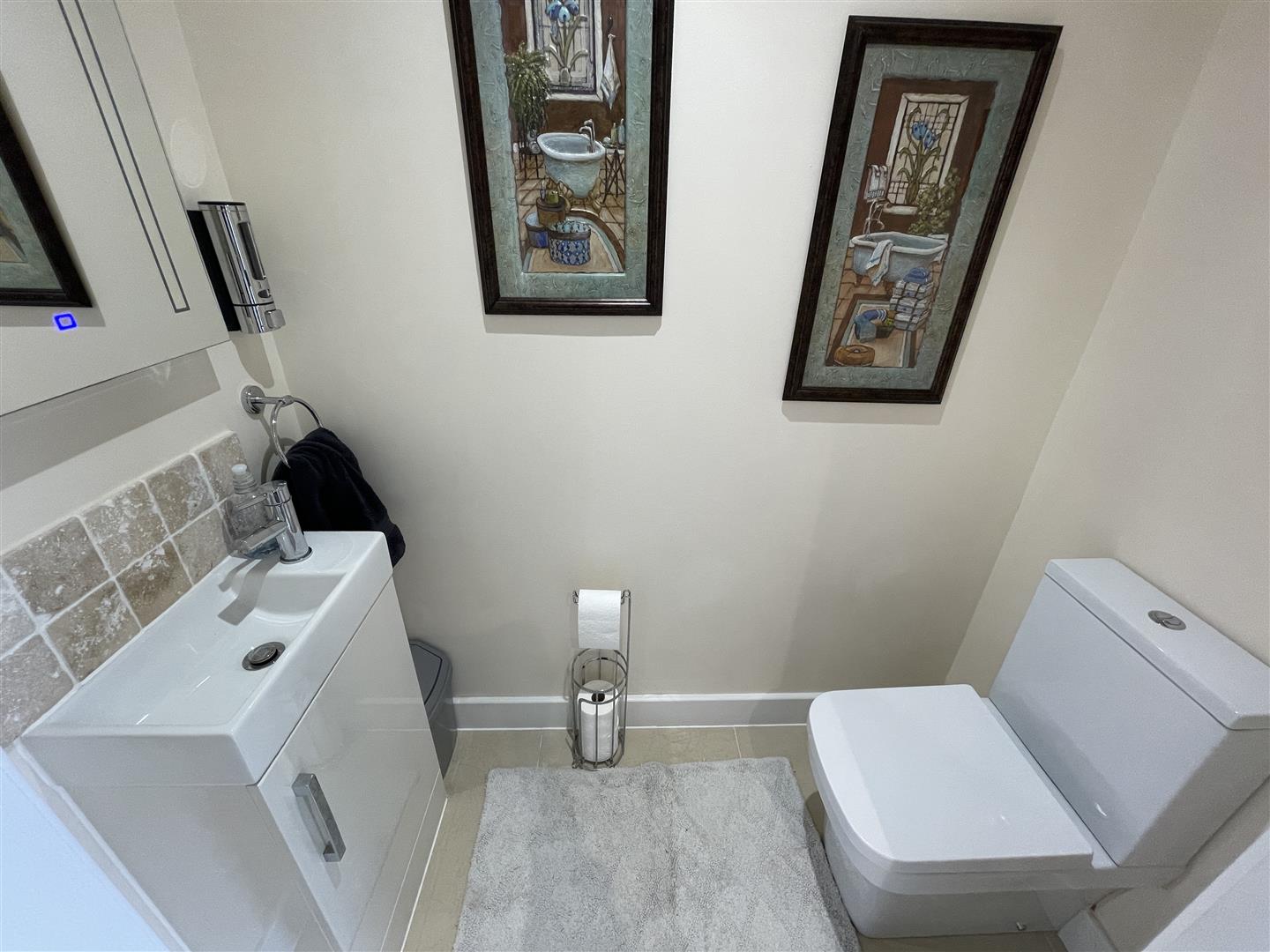 Wc - Low level WC, vanity unit with mixer tap, illuminated mirror, LVT flooring.