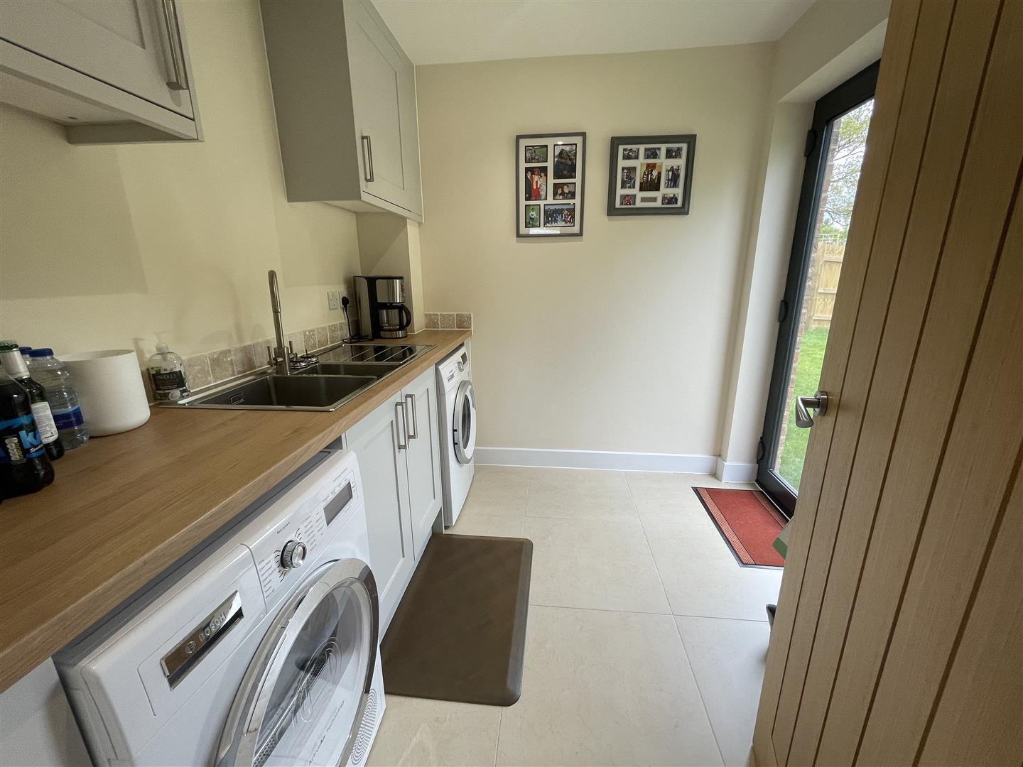 Utility - 0.61m.11.89m x 0.61m.5.18m (2.39 x 2.17) - Space and plumbing for washing machine and tumble dryer, two bowl sink with mixer tap, cupboards housing the hot water tank and heat ventilation and heat recovery system (MHVR), LVT flooring, part glazed door leading outside.