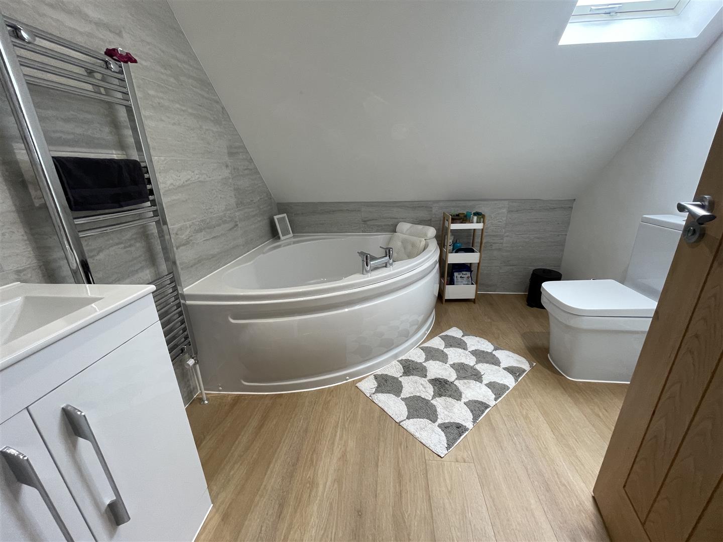 En-Suite - White sanitary ware, ceramic wall tiles, large corner shower cubicle, vanity unit with mixer tap, illuminated heated mirror, chrome heated towel rail, Velux roof window, LVT flooring.