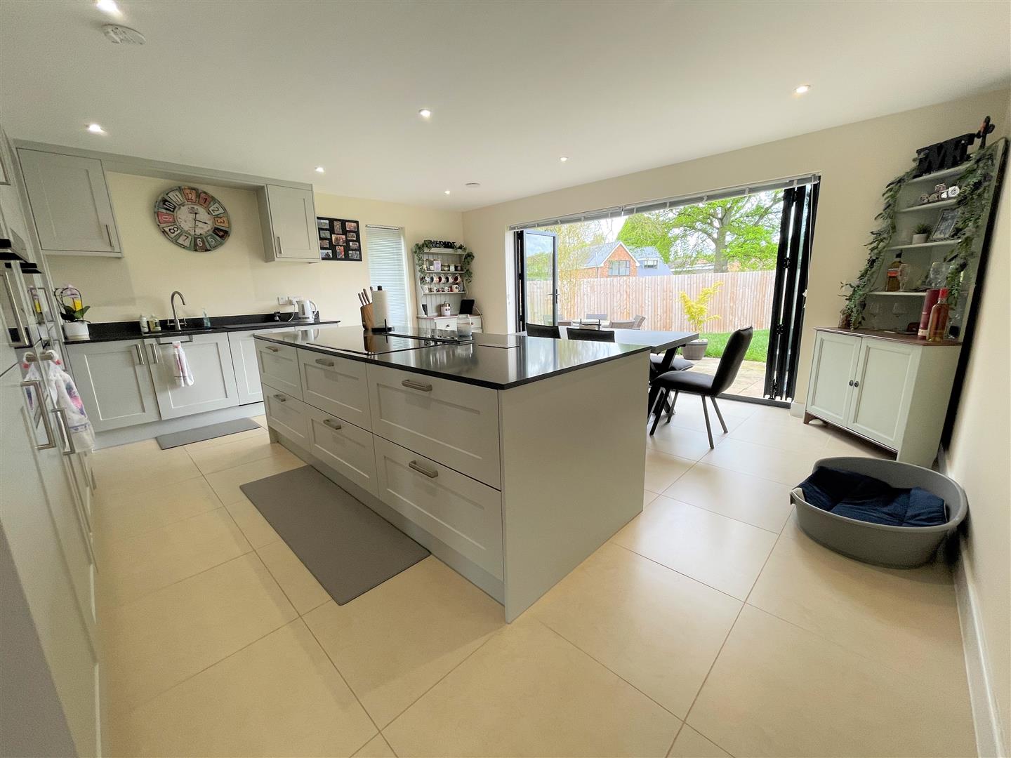 Kitchen/Dining Room - 5.05 x 5.39 (16'6" x 17'8") - A large open plan room with ample worktop area and plenty of space for a large dining table and chairs. The dining area features full width bi-fold doors opening out on to the patio and garden. The kitchen is locally handmade and features soft close doors and drawers, granite worktops and upstands, one and a half bowl sink with mixer tap, quality Bosch built in appliances to include two full sized fridge/freezers, dishwasher, oven, microwave oven, warming drawer, five ring induction hob and electrically operated hidden extractor. LVT flooring throughout.