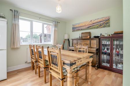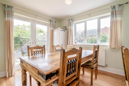 Dining Room - 3.58m x 2.97m (11'9 x 9'9) - Wood laminate flooring, double radiator, side aspect French doors to patio and gardens, rear aspect window offering pleasant elevated views.