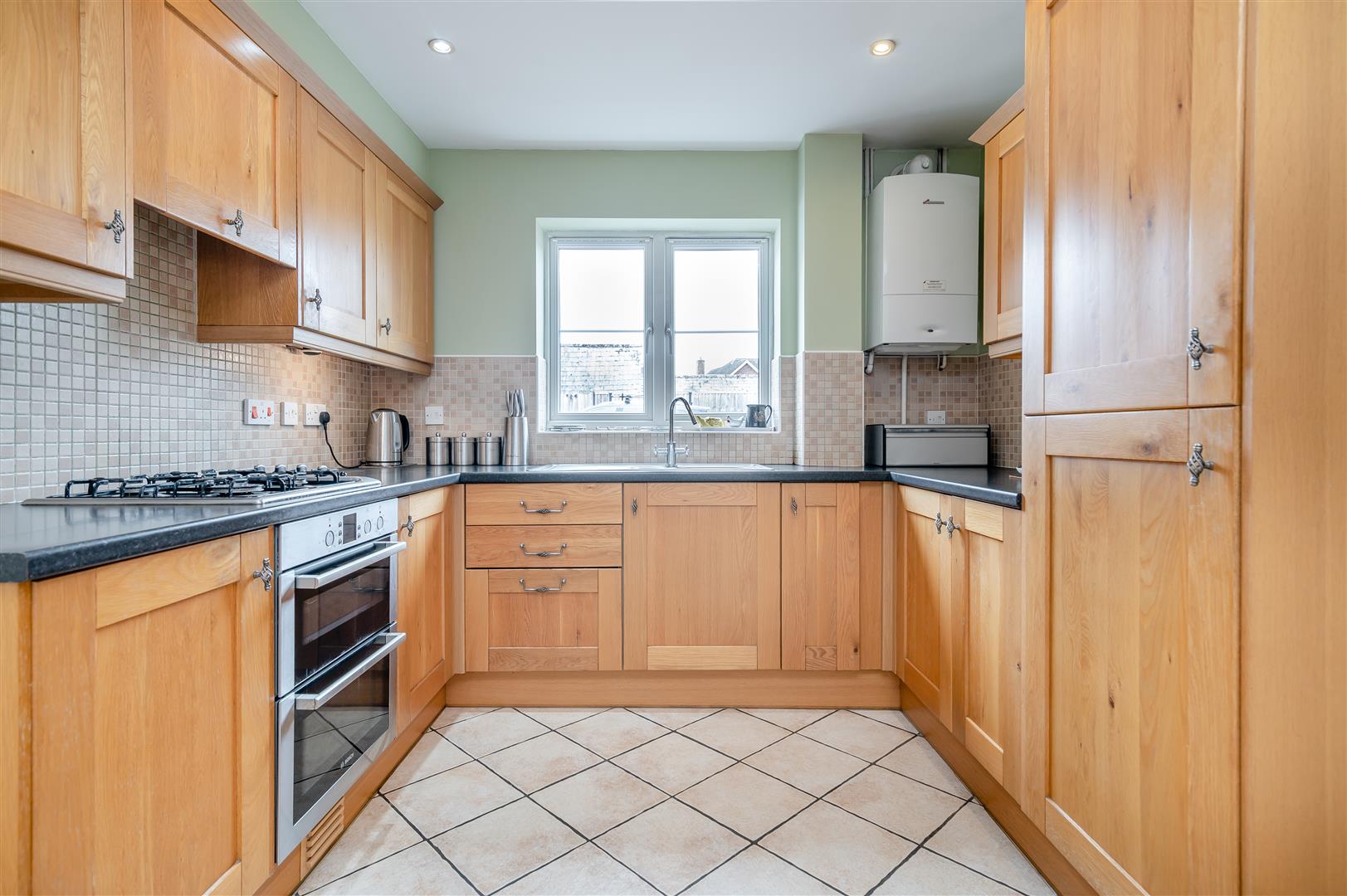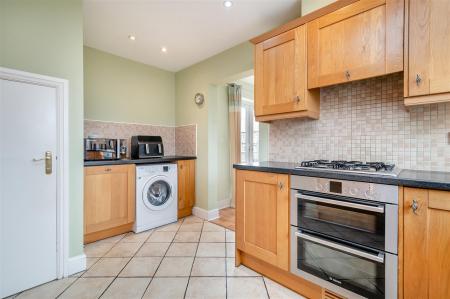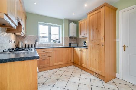 Kitchen - 4.17m x 2.84m (13'8 x 9'4) - Door to under stairs storage cupboard. The kitchen comprises of a range of base and wall mounted units with laminated worktops and tiled splashbacks, one and a half bowl stainless steel sink unit with mixer tap, integrated fridge and freezer, integrated dishwasher, plumbing for washing machine, integrated double oven with four ring gas hob and extractor fan over, tiled floor, inset spotlighting, Worcester LPG-fired boiler supplying the hot water and central heating (boiler to be replaced by the current vendors before completion of sale). Opening through to: