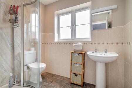 En-Suite Shower Room - 2.36m x 1.68m (7'9 x 5'6) - Large walk-in double shower cubicle accessed via rounded glazed screen with inset detachable hand shower, laminate splashbacks, tiled splashbacks, chrome heated towel rail, WC, wash hand basin, shaver light point, extractor fan, spotlighting, front aspect frosted window.