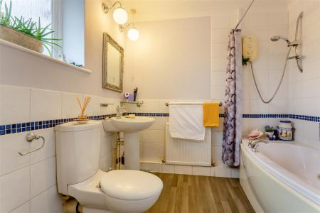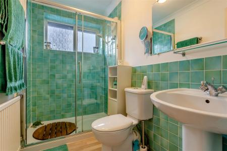 Shower Room - Fitted double shower cubicle and tray, shower, tiled surround, close coupled WC, pedestal wash hand basin with tiled splashback, mirror over, single radiator, front aspect frosted window.