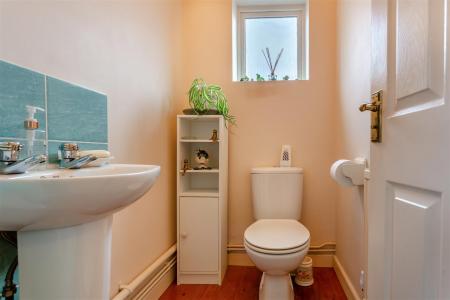 Cloakroom - White suite comprising of close coupled WC, pedestal wash hand basin and tiled splashback, oak flooring, single radiator, side aspect frosted window.