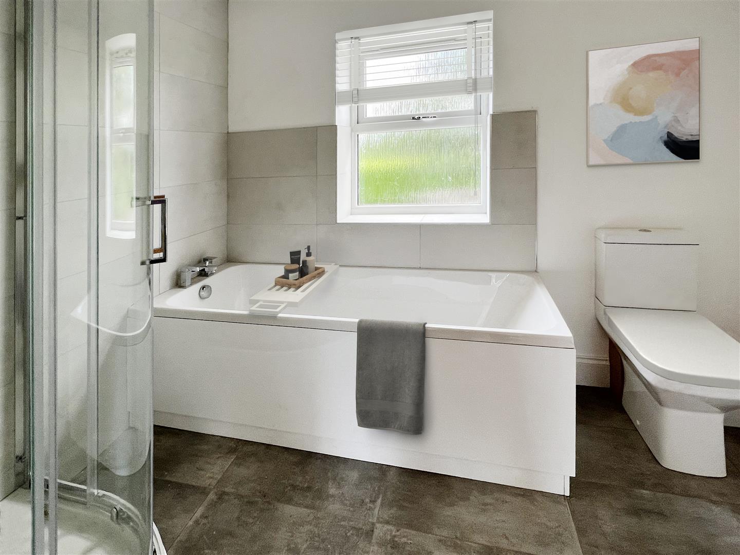 Bathroom - 2.64m x 2.01m (8'8 x 6'7) - White suite comprising panelled bath, tiled surround, separate shower cubicle and tray, shower, tiled surround, vanity wash hand basin, cupboards below, tiled splashback, close coupled WC, heated towel rail, rear aspect frosted window.