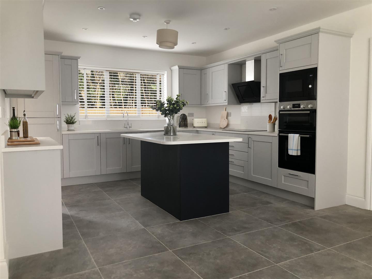 Kitchen / Dining Room - 7.14m into front aspect bay window x 3.84m (23'5 i - Fitted kitchen to comprise one and half bowl single drainer sink unit with mixer tap, cupboards under, range of base and wall mounted units, central breakfast island, built-in cupboards below, integrated dishwasher, double oven and microwave, fridge / freezer, dishwasher, hob, built-in cooker hood above, tiled flooring with under floor heating, spot lighting, front aspect bay window, personal door to the garage, rear aspect west facing window overlooking the private gardens.