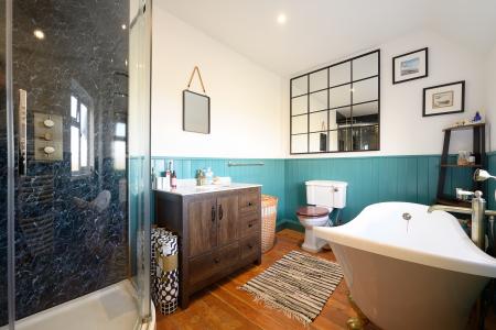 Completing the upper floor is an elegant family bathroom, beautifully appointed with an antique clawfoot bath, a walk-in shower with dual shower heads, a marble-topped vanity unit, and a WC, creating a luxurious and relaxing retreat.