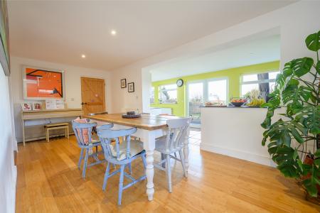 The main entrance opens into a welcoming entrance hall, offering ample space for coats and boots after days spent exploring the surrounding countryside. Two reception rooms sit to either side: to the left, a handsome sitting room centred around an exposed brick fireplace with a wood-burning stove, creating a warm and inviting focal point. To the right, a versatile second reception room is currently arranged as a playroom. These spaces flow naturally through to the dining room, a beautifully bright and generous area, which in turn connects seamlessly to the kitchen through an elegant cased opening.