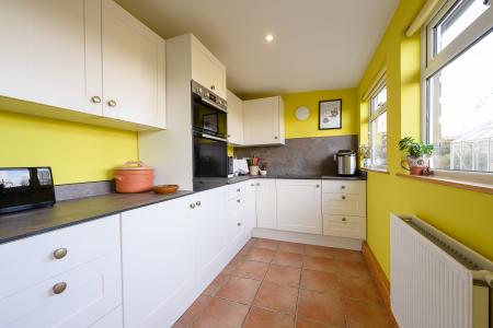 The recently refurbished kitchen is both stylish and practical, showcasing Shaker-style cabinetry complemented by hardwearing Zenith worktops and a range of modern appliances, including a double oven and an induction hob. Further features include a contemporary sink with mixer tap, space for a fridge/freezer, and provision for a dishwasher. Flooded with natural light, this inviting space enjoys an attractive outlook across the rear garden, while French doors open onto a flagstone patio terrace-an ideal setting for alfresco dining and relaxed entertaining during the warmer months.