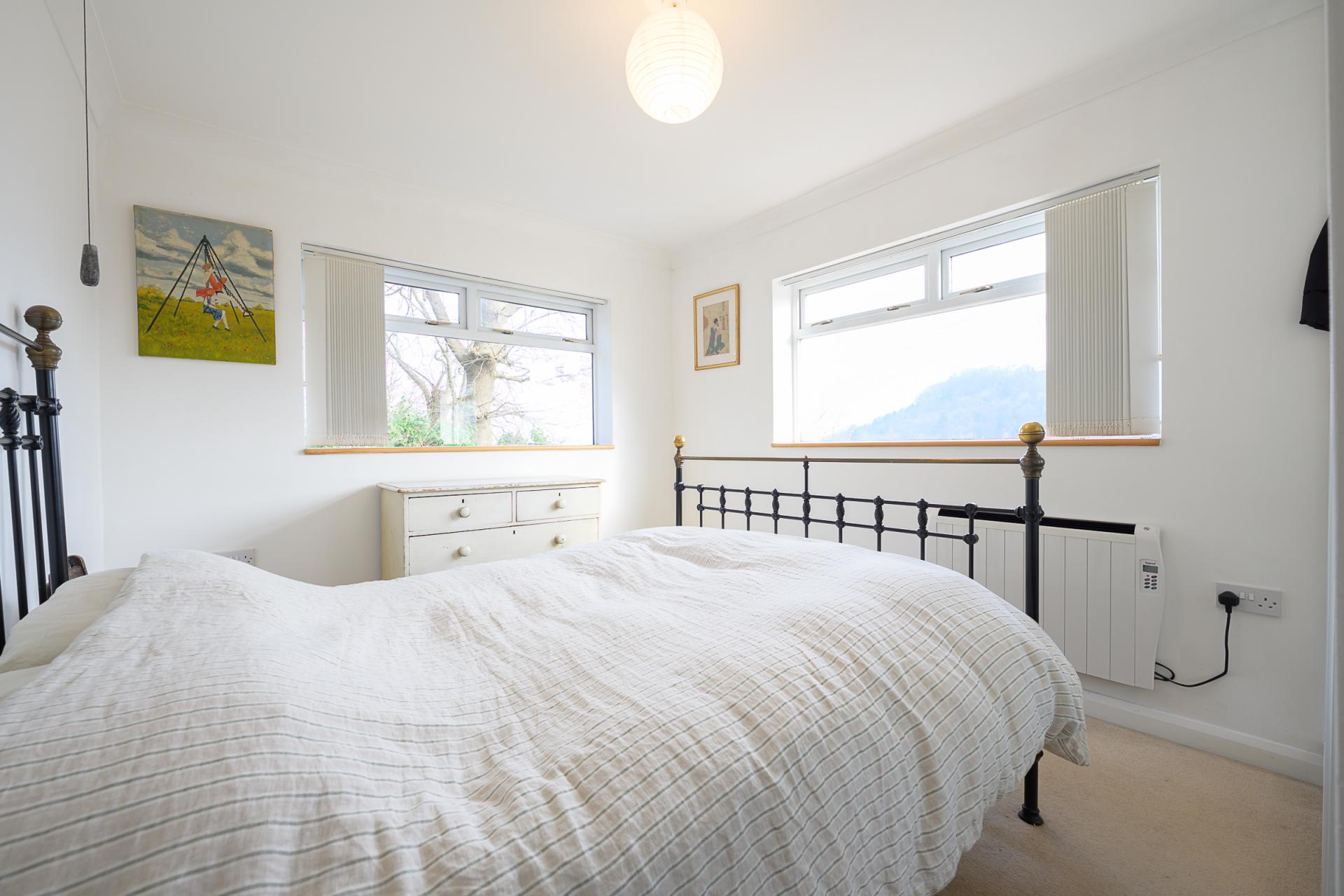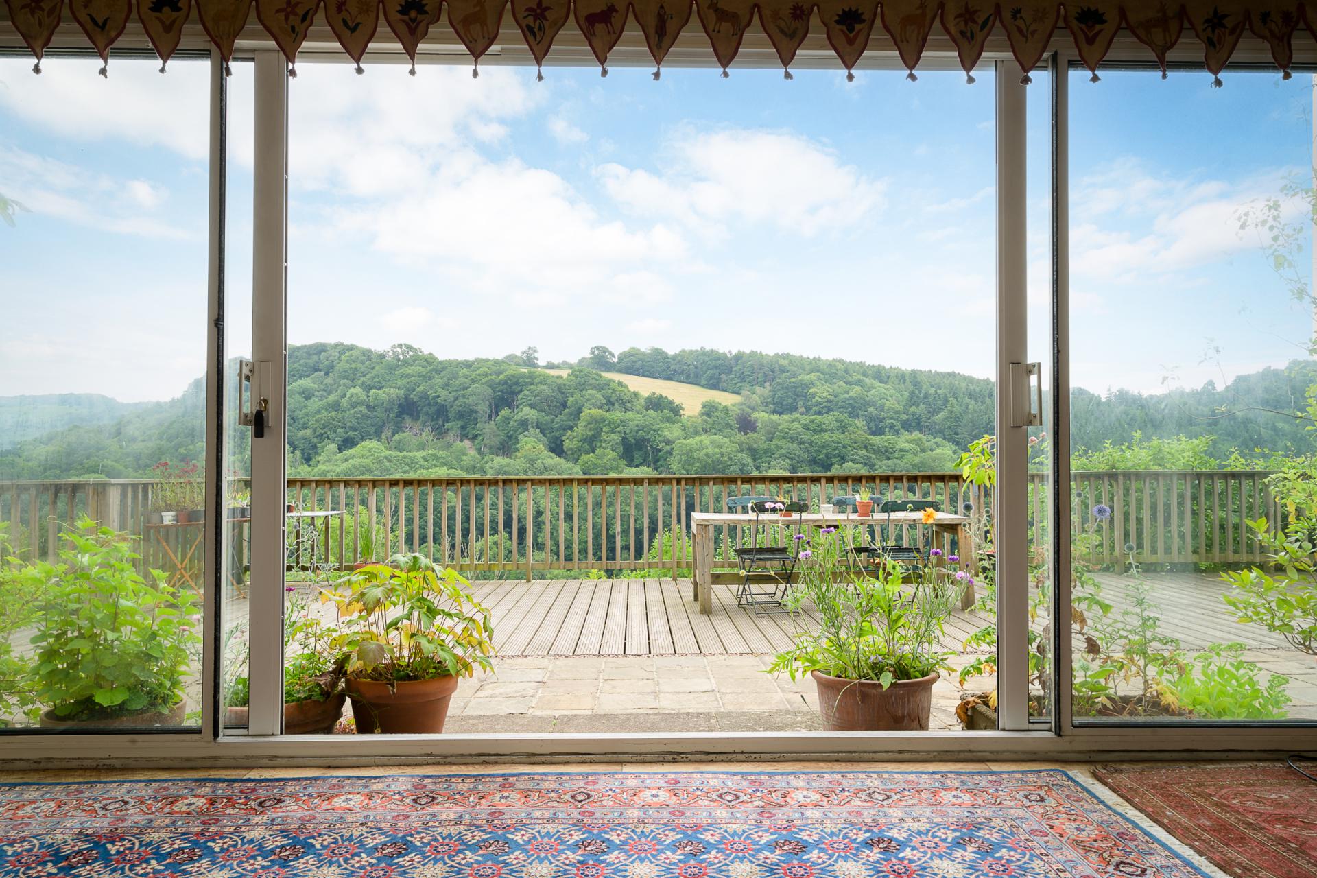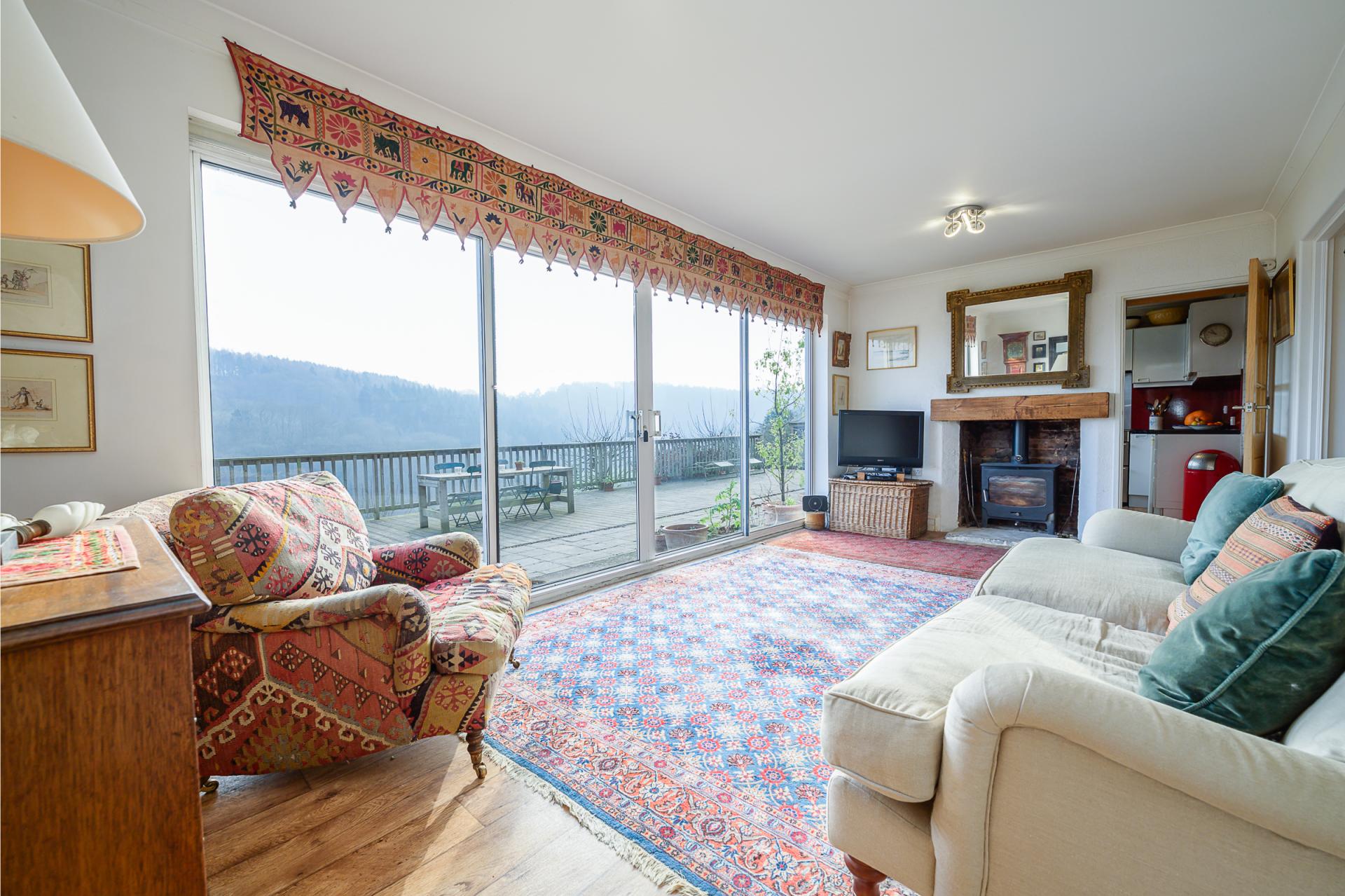 The sitting room also showcases the panoramic view as it features full-height wall-to-wall windows and a set of sliding glass doors. This space also includes an inset log-burning stove, housed beneath a wooden mantle, therefore presenting a cosy space to enjoy the Wye Gorge during the colder months of the year.