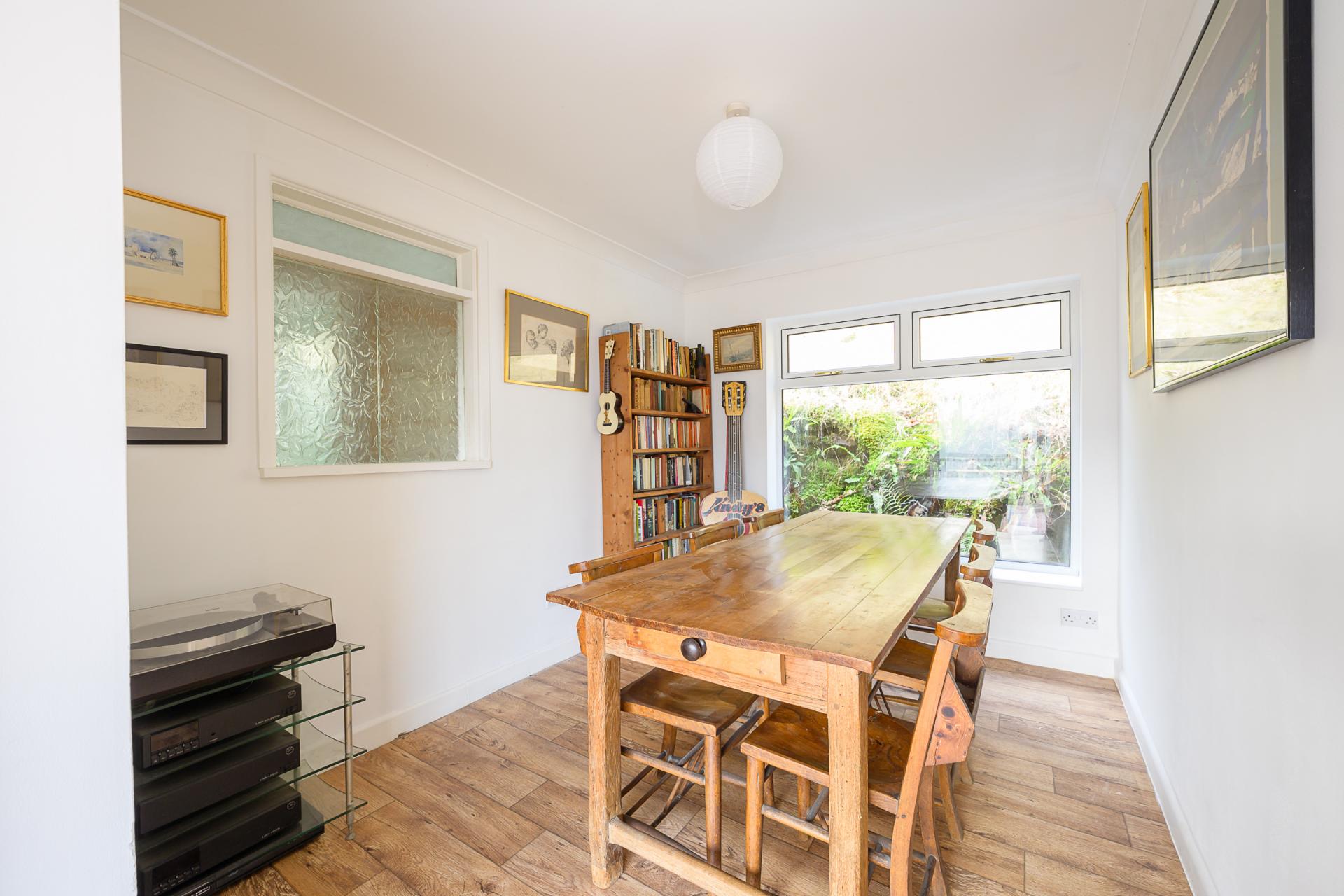 An open archway links the sitting room with a formal dining area, which includes a window that lets light pour in and captures a view of the rear garden.