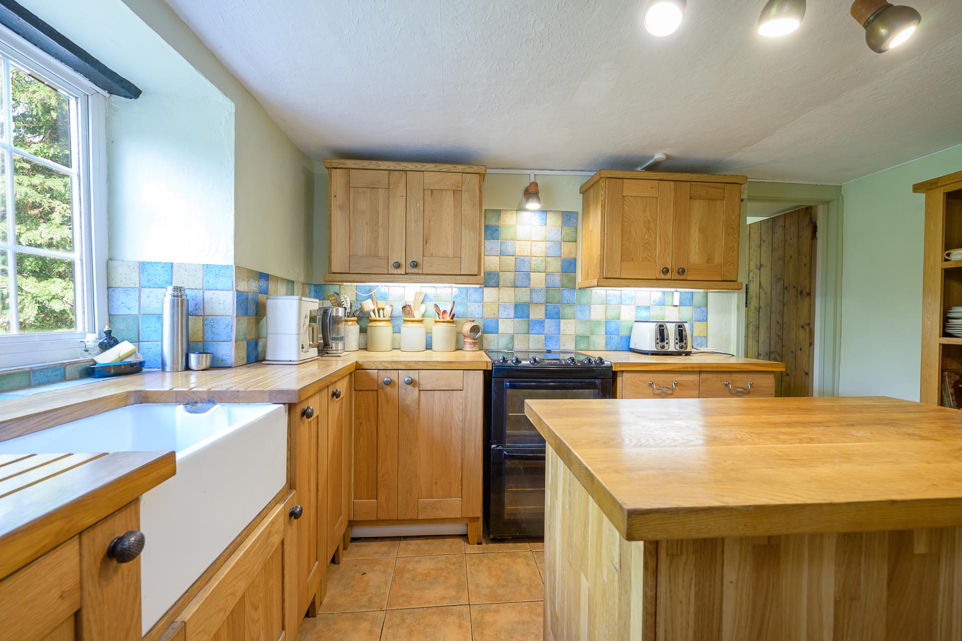 The farmhouse-style kitchen includes solid oak shaker-style units and countertops, plus a Belfast sink. Splashback tiling adds a subtle pop of colour, and in terms of practicalities, there is a double electric oven with a ceramic hob.