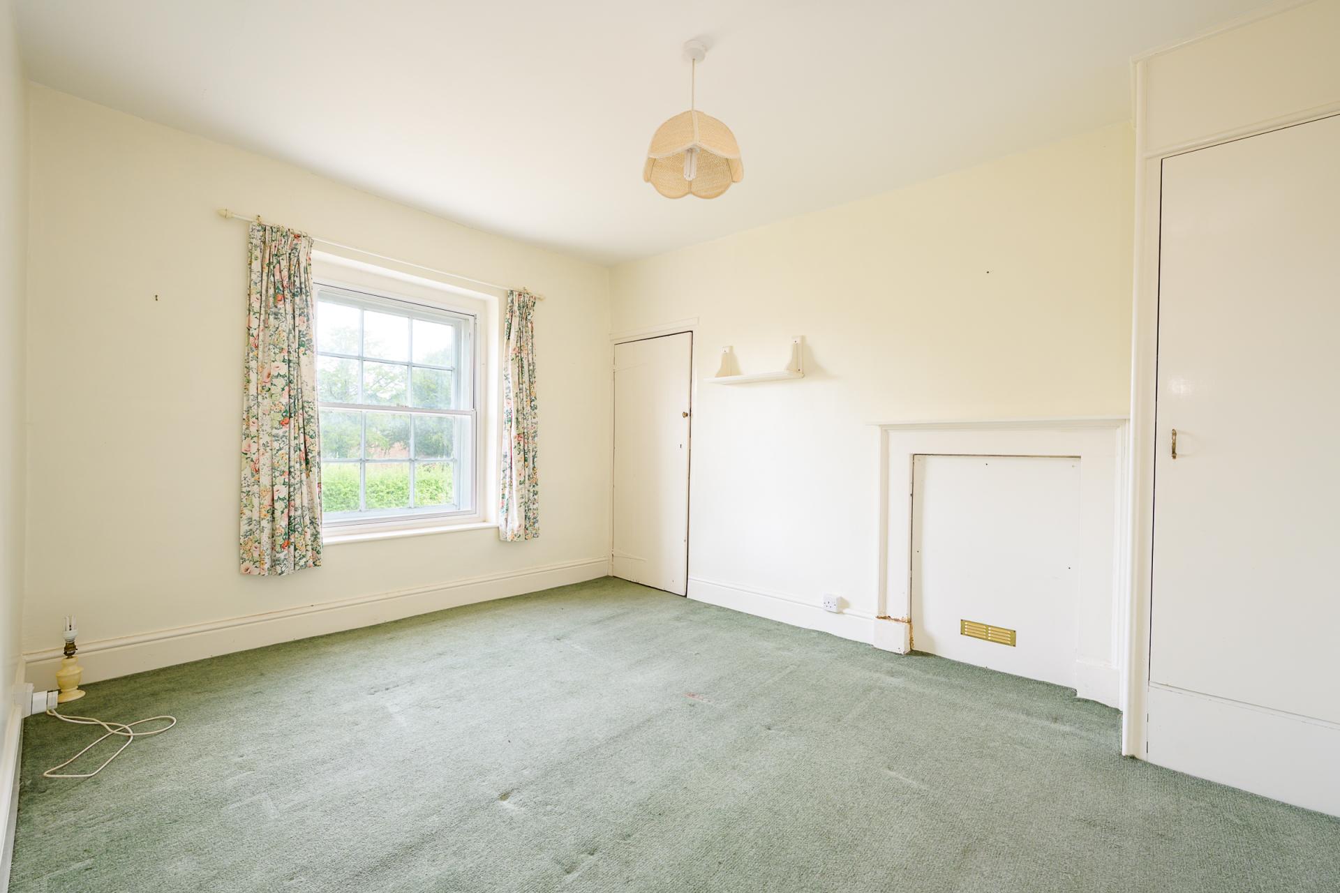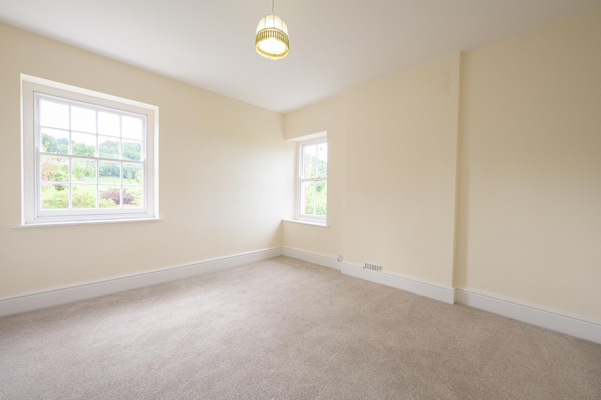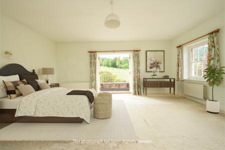 A staircase in the reception hall leads up to a large landing, which may serve as an office, reading area, or playroom. A door at the end of the landing splits the top floor into two wings. The larger portion features the beautifully bright master bedroom, which is dual aspect and showcases an elevated view over the garden and Penyard Hill beyond. A set of French doors leads outside to a balcony, which presents a peaceful spot to soak in the sublime surrounding scenery.