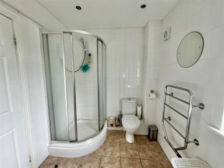 Bathroom - 3.86m x 2.01m (12'08 x 6'07) - Modern four piece white suite comprising a bath with tiled surround, shower cubicle with electric shower, low level w.c, pedestal handbasin, electric heated towel rail, tiled floor, obscured front aspect window, airing cupboard with hot water immersion tank.