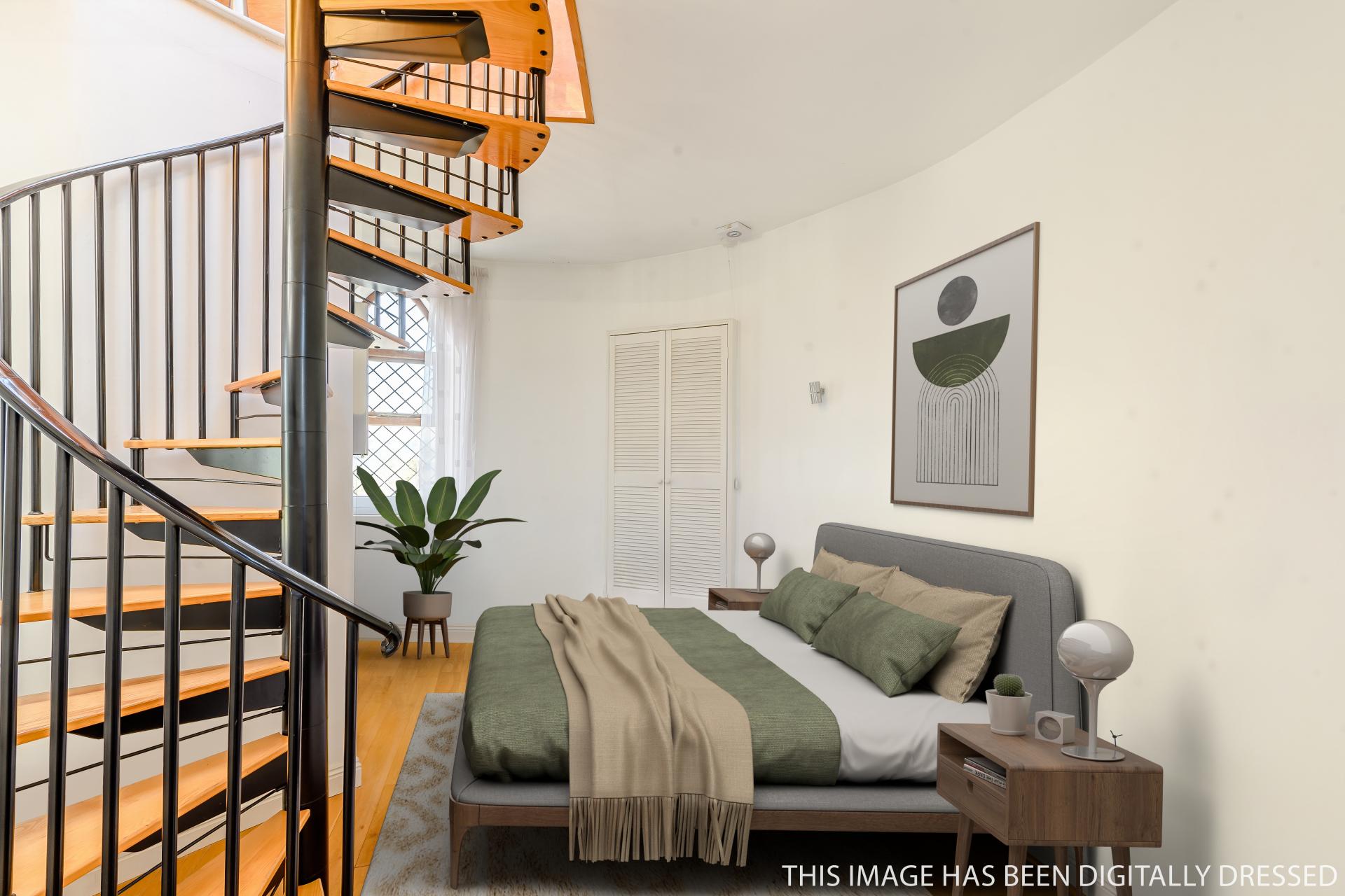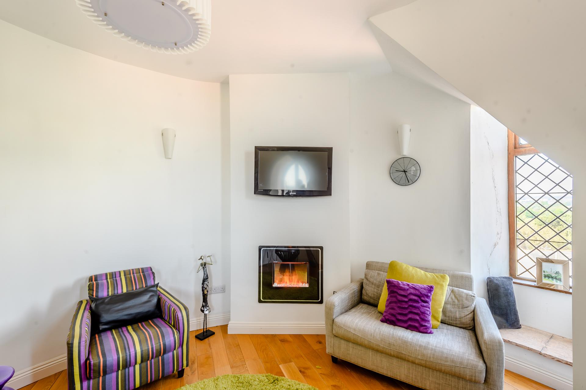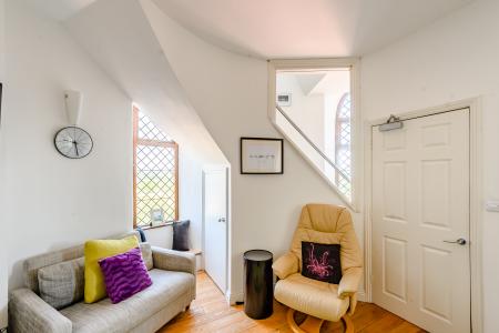 A carpeted spiral staircase winds up to the lounge. The walls between the staircase and the rooms are fitted with fire retardant glass to let in light and views from the original arched windows. This room also benefits from a hardwood floor and a modern electric fireplace.