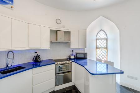 An arched doorway leads to the light and airy kitchen which includes a fridge with small freezer compartment, a hob, oven and a miniature dishwasher. Electric blue worktops inject a splash of colour into the bright, white room. In addition, a cloakroom is tucked away to the left of the front door.
