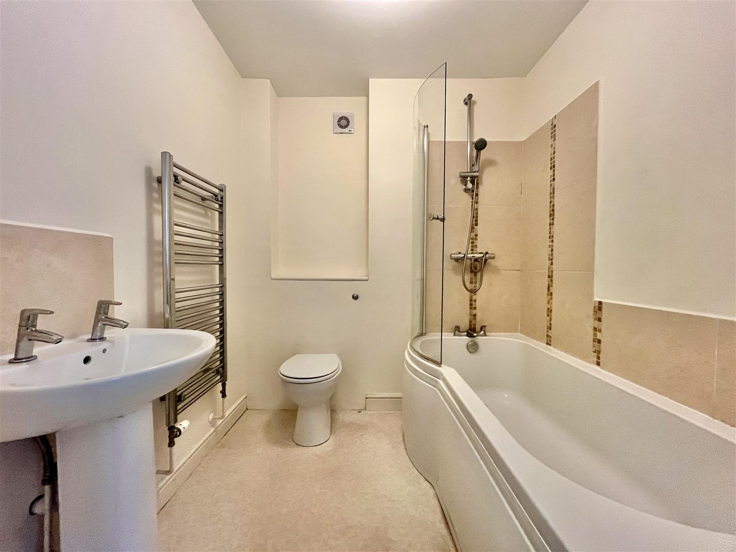 En-Suite Bathroom - 2.06m x 2.06m (6'09 x 6'09) - A three piece white suite comprising a bath with mains fed shower over, low level w.c, pedestal washbasin with tiled splashbacks, heated towel rail, extractor fan.