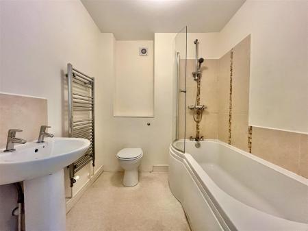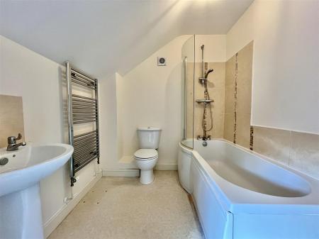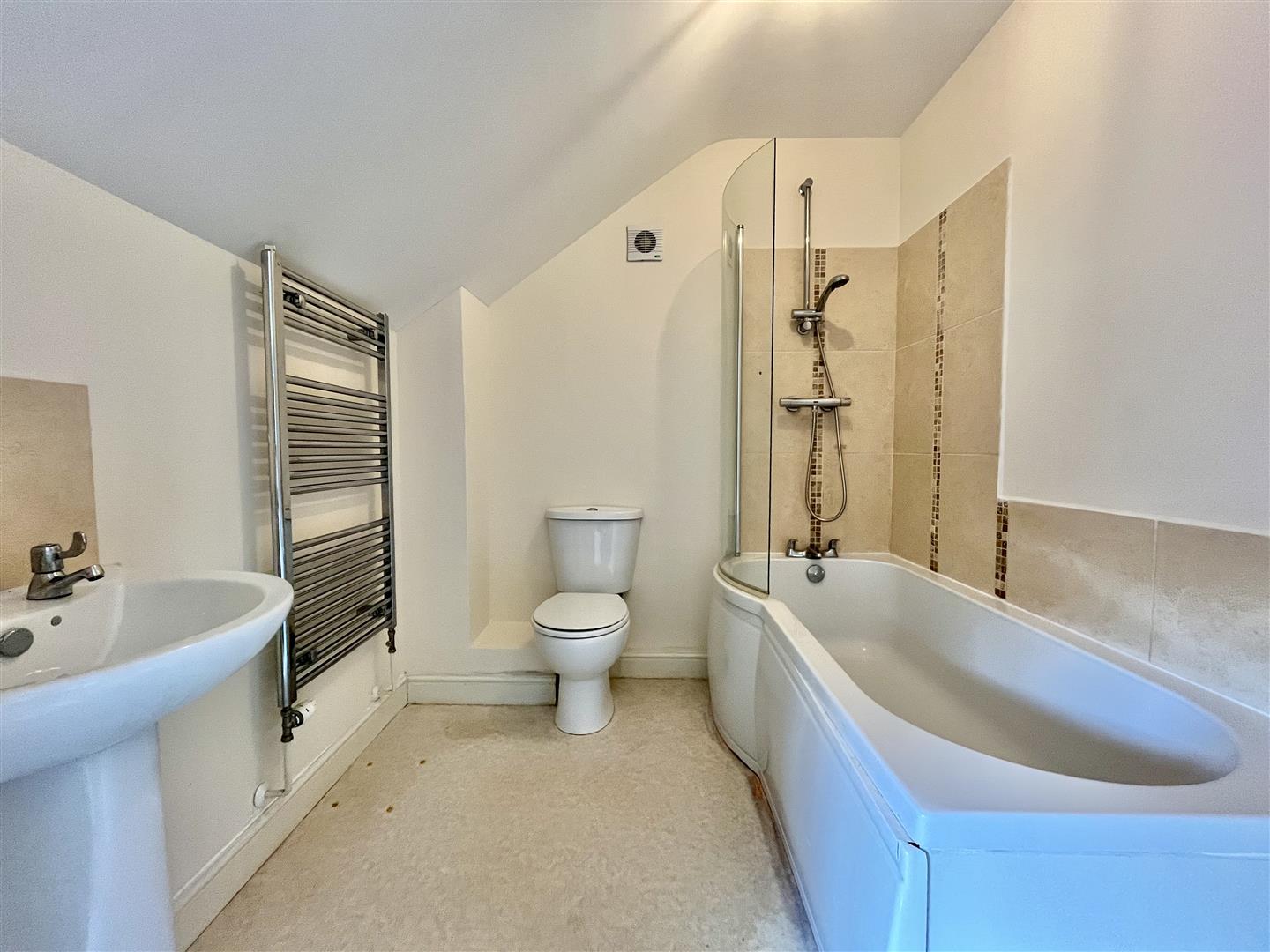 En-Suite Bathroom - 1.96m x 1.83m (6'05 x 6'00) - Three piece white suite comprising a bath with mains fed shower over, low level w.c, pedestal washbasin with tiled splash-backs, heated towel rail, extractor fan.