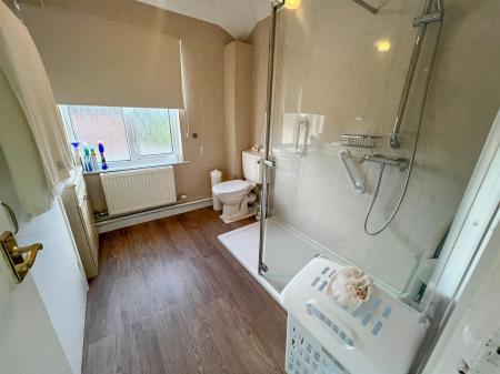 Family Bathroom - 2.49m x 2.39m (8'2" x 7'10") - Comprising coloured suite with close coupled WC, vanity wash hand basin with cupboards beneath, large walk-in shower cubicle with wet boarding, mains fed shower, tiled walls, ceiling light, non-slip flooring, rear aspect window, door to linen cupboard with shelving.