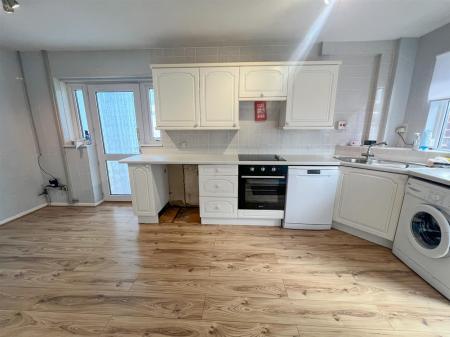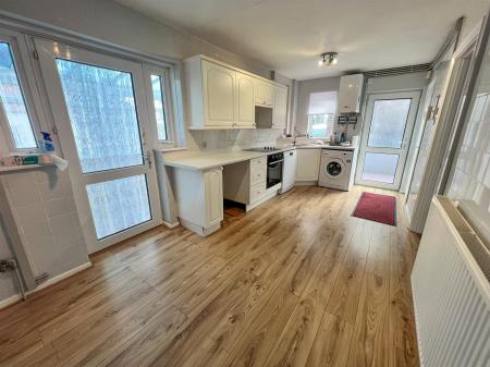 Kitchen/Dining Room - 5.44m x 2.54m (17'10" x 8'4") - One and a half bowl and two quarter sized drainers with monobloc mixer tap over, rolled edge worktops, range of base and wall mounted units, electric hob and oven built in, tiled surrounds, power points, space for washing machine, dishwasher, ceiling spotlights, tiled walls, central heating timer controls, single radiator, laminate flooring, wall mounted gas boiler, door to understairs storage cupboard with lighting and power, side aspect window and door. A further door gives access into: