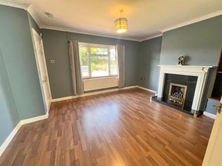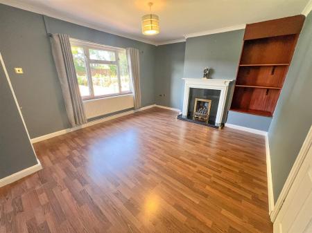 Lounge - 4.50m x 3.71m (14'9" x 12'2") - Feature fireplace with living flame gas fire inset, wooden mantle and surround, marble backing & hearth, alcoves with shelving on one side, power point, TV point, ceiling light, coving, double radiator, laminate flooring, front aspect window overlooking the garden, parking and driveway. Wooden panel door giving access into: