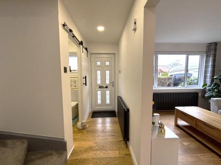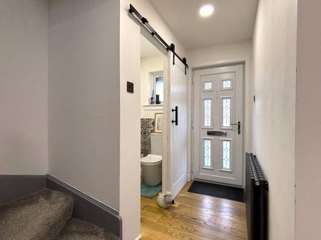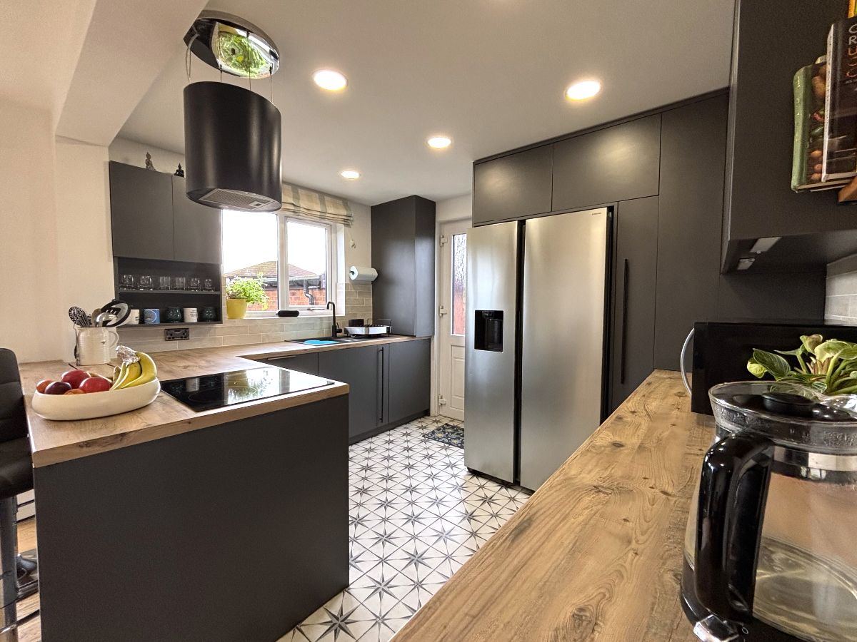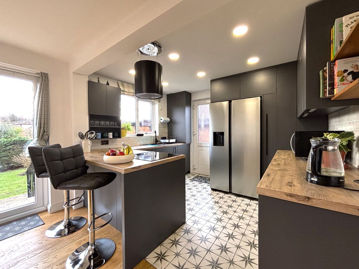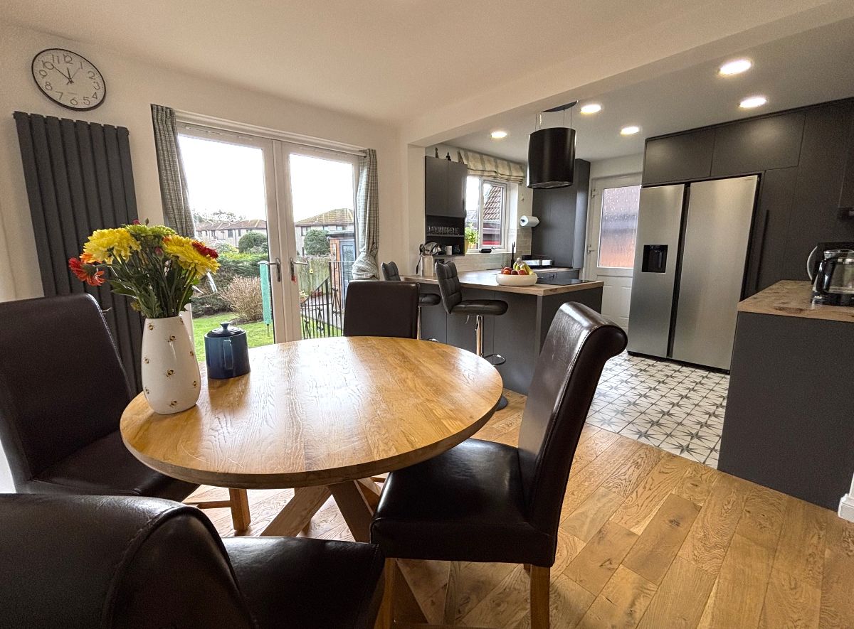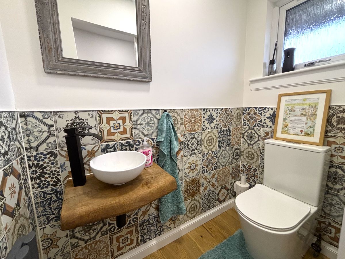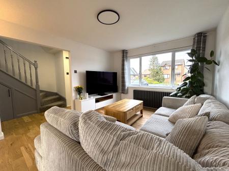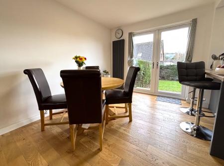 Front door opens to welcoming hallway with stylish WC to side with sliding door access. There is storage under the stairs and open plan access into Lounge. The modern styled lounge is bright and airy and boasts dual aspect and an open plan arrangement to family dining room which in turn is open plan to the kitchen. Patio doors from dining room area lead out to south-facing garden. The contemporary fitted kitchen boasts ample worksurface space with stylish cupboard storage in slate grey with integrated oven, hob, overhead extractor, dishwasher and washing machine. There is space for a free-standing American stye fridge freezer. Door leads out to side garden. On the upper floor are three good-sized bedrooms and bathroom. Bedrooms one and two are double bedrooms with each providing fitted wardrobe storage. Bedroom three also boasts fitted storage and is a good-sized single bedroom but would also be an ideal home office. The modern family bathroom provides a suite of bath with shower over, washbasin and WC. The property benefits from gas central heating (NEW Boiler) and double glazing. Externally to the front is a pleasant front garden with lawn and planted border with hedge to one side and a large driveway (recently re-surfaced) which can accommodate 5 to 6 cars. The driveway leads up to detached single garage with light and power. To the rear is a good-sized south-facing garden with patio area, private seating area, shed and lawn. The garden has high-hedge surround which allows a good degree of privacy.