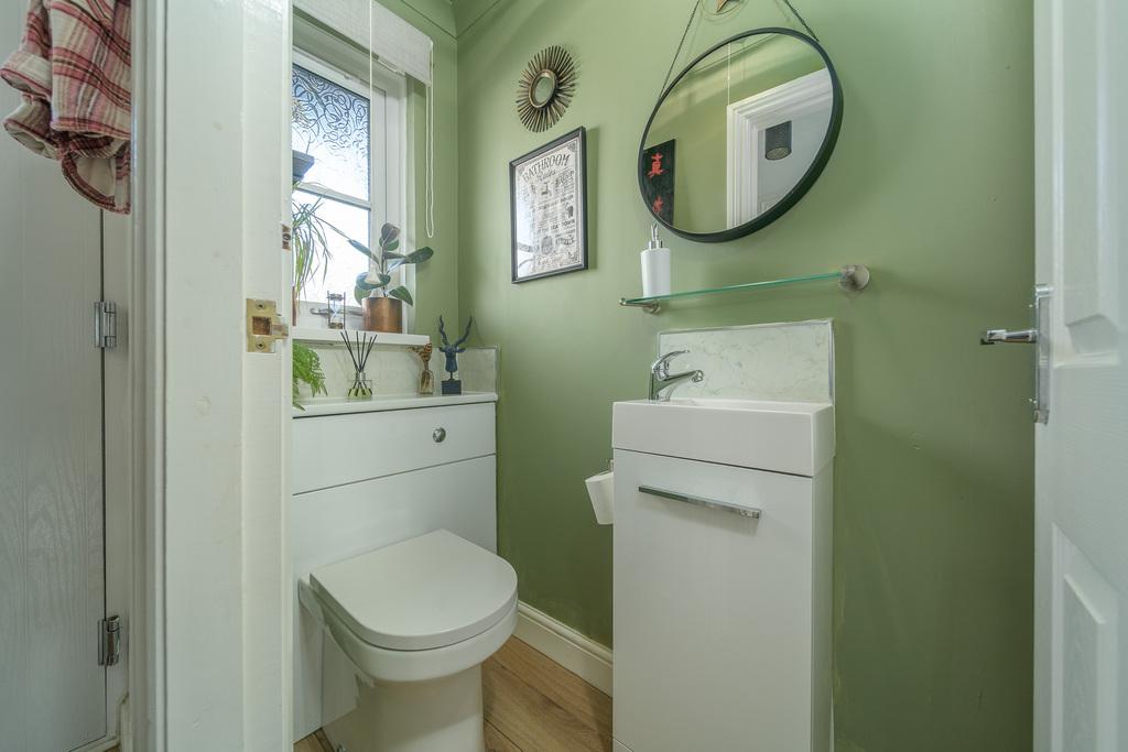 The front door opens into an entrance hallway which offers useful space to hang coats and store shoes in addition to housing the electrical consumer unit. The space is finished with laminate wood-look flooring which continues throughout the ground floor creating a seamless transition between the different spaces. The hallway provides convenient access to the spacious kitchen, welcoming lounge-diner and the ground floor WC which is a superb asset as it negates the need to continually frequent the upstairs facilities. The suite comprises a concealed cistern toilet with a push button behind and a rectangular sink on top of a vanity unit. A window allows for natural light.