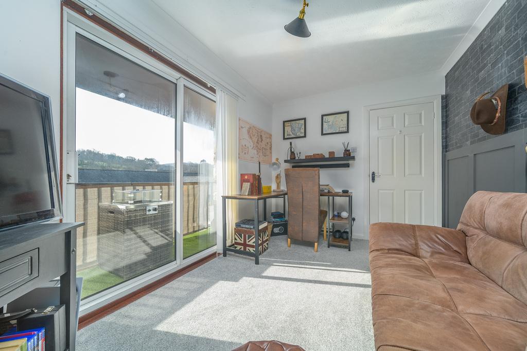 Bedroom 2/ first floor lounge is a spacious double room with a window taking advantage of views to the rear of the property. This room boasts sliding doors which open onto a balcony which is the perfect place in which to catch the westerly sunshine with a glass of wine in the evening. This room is currently utilised as an office/snug.