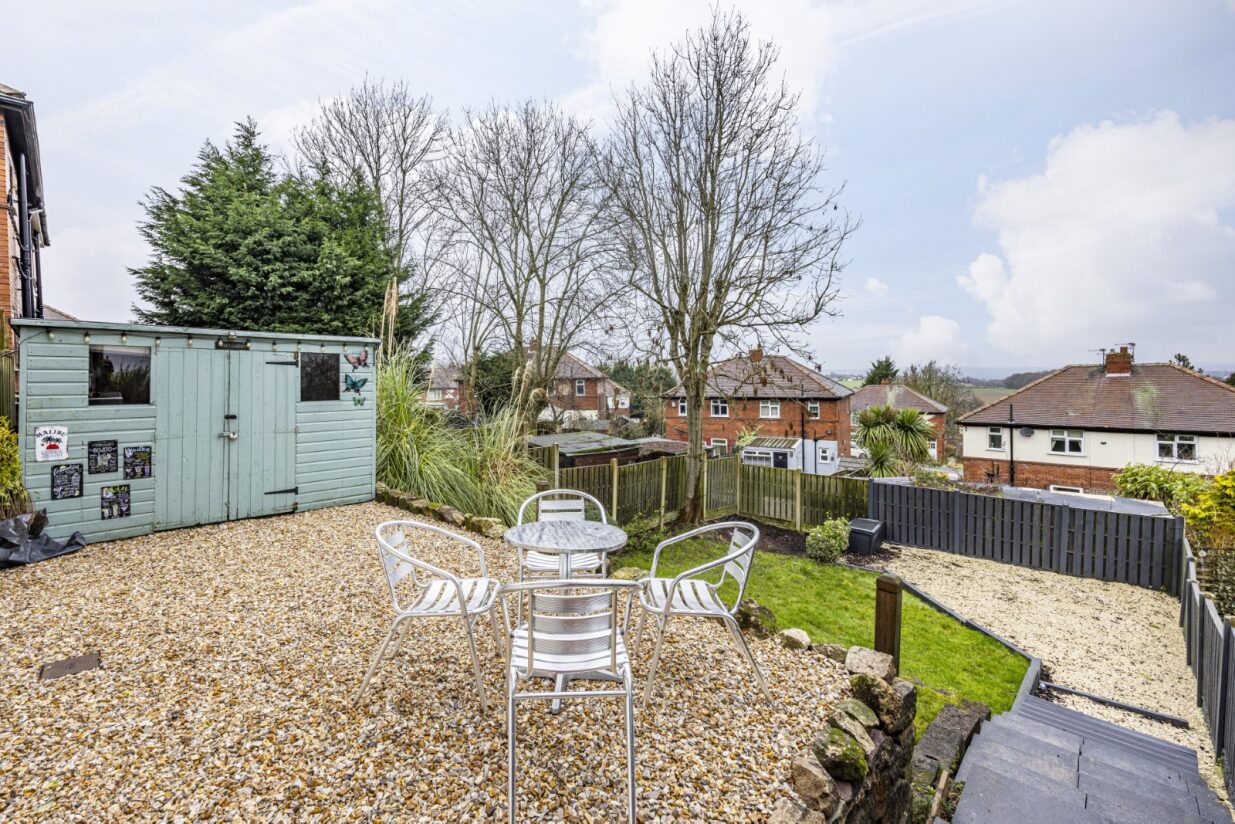 - Generous Well-Kept Rear Garden with patio Seating, a wooden storage shed and a View!