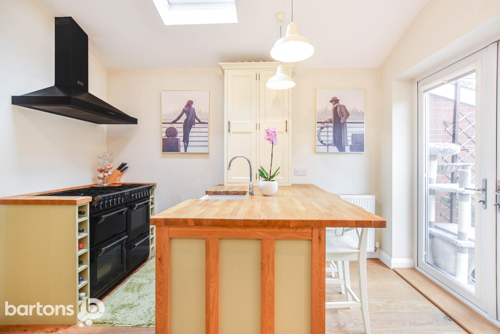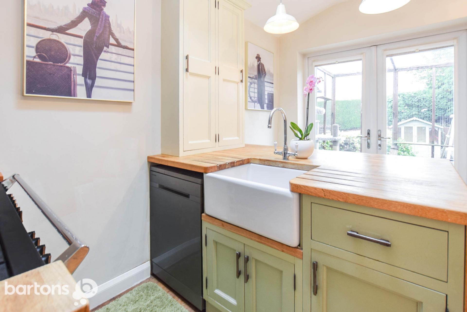 - Breakfast Bar Island Seating With Inset Belfast Style Sink and Contrasting Solid Wood Work Tops