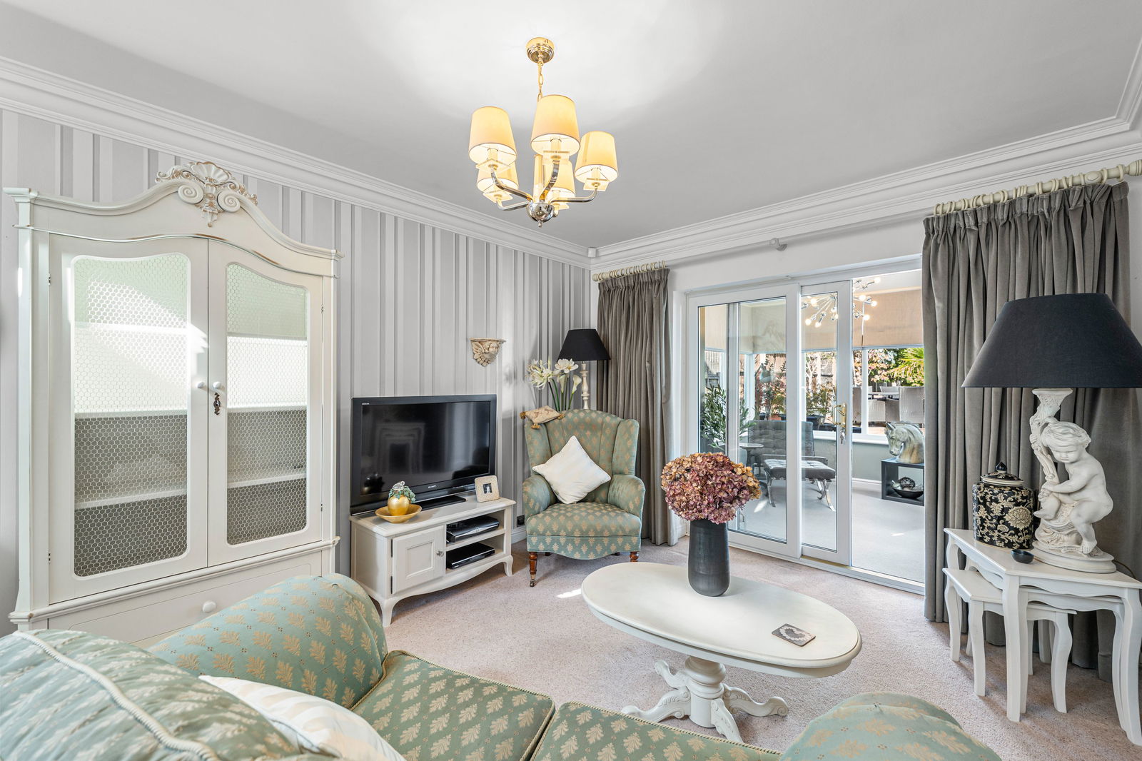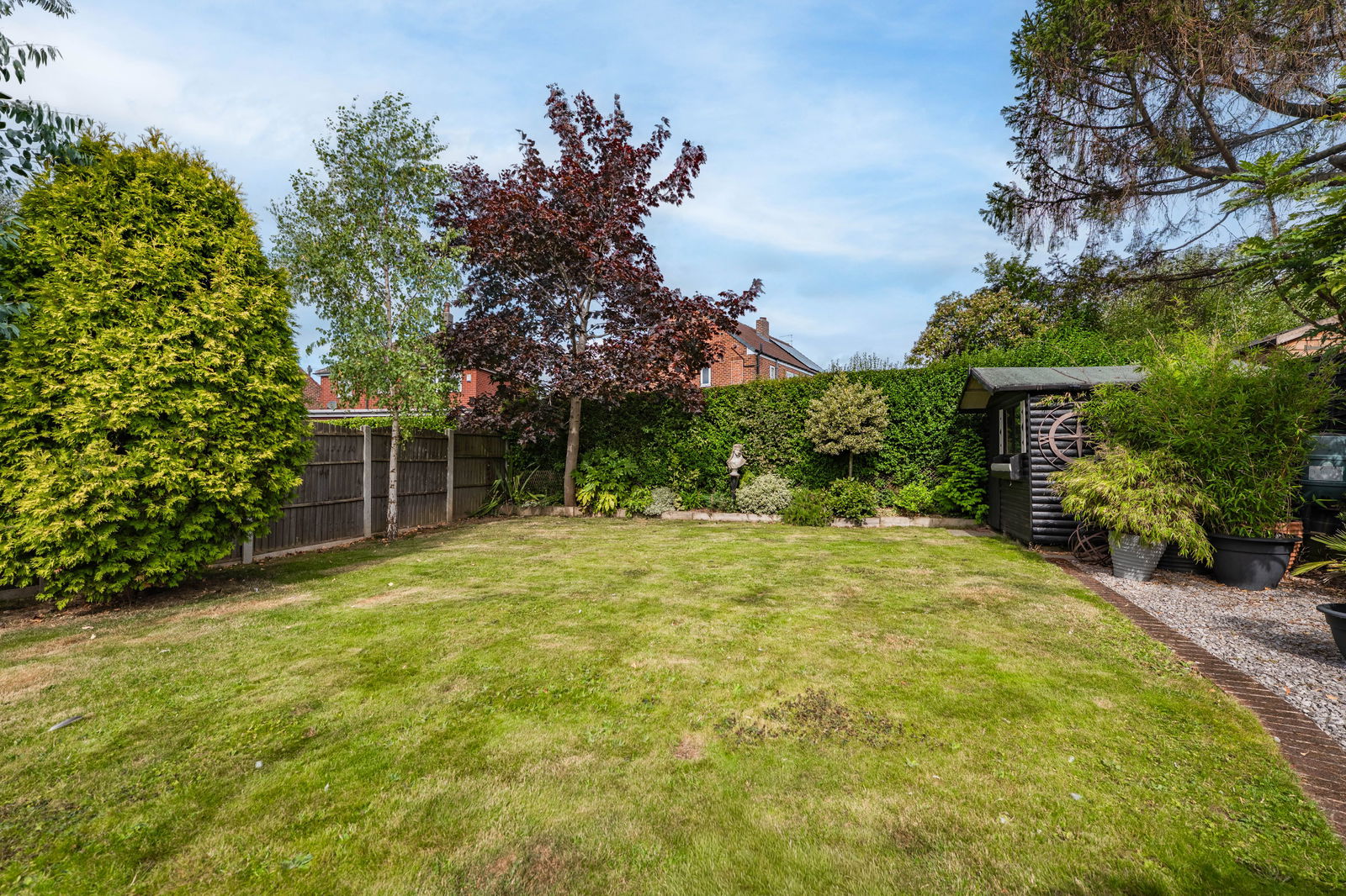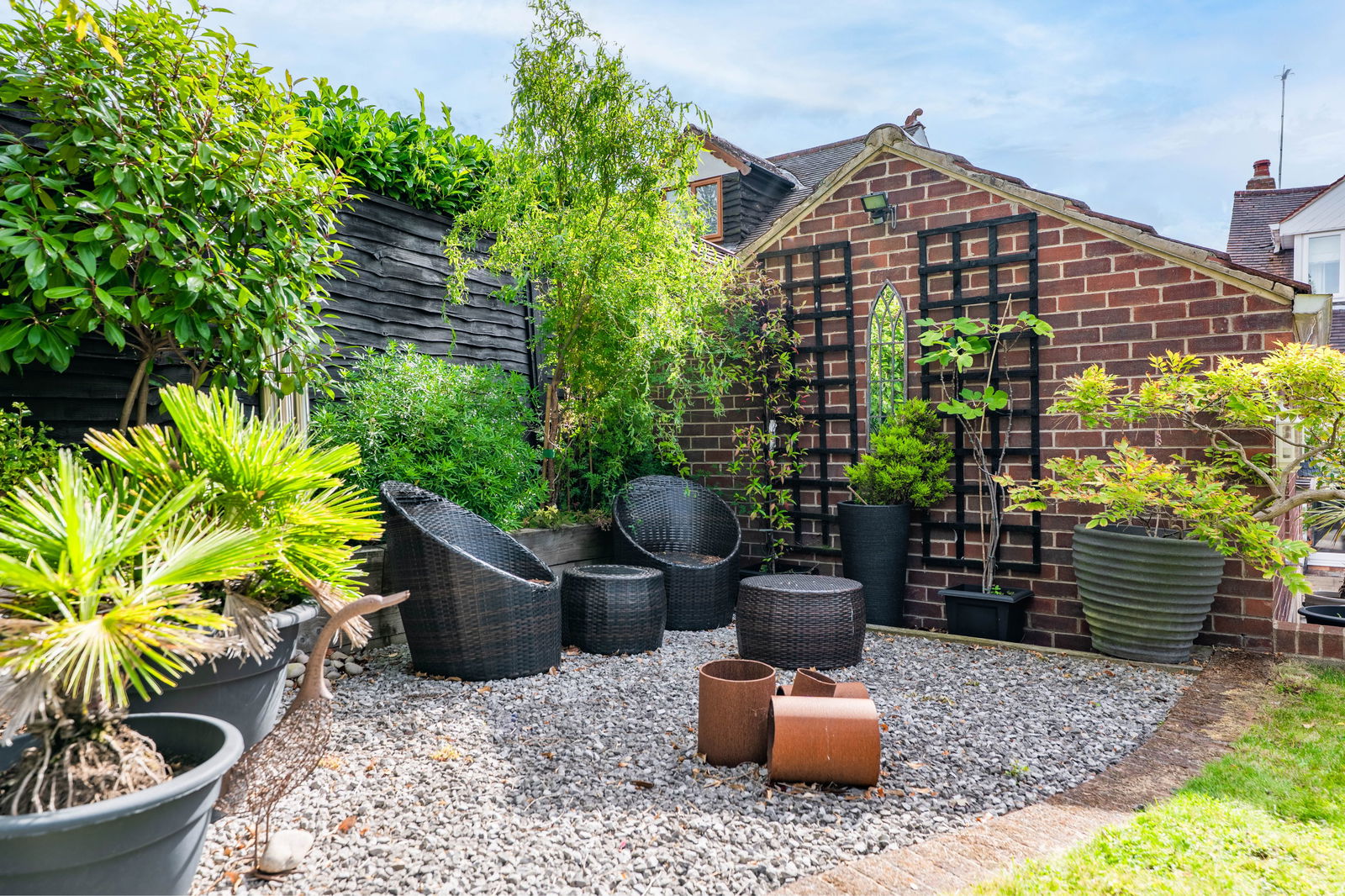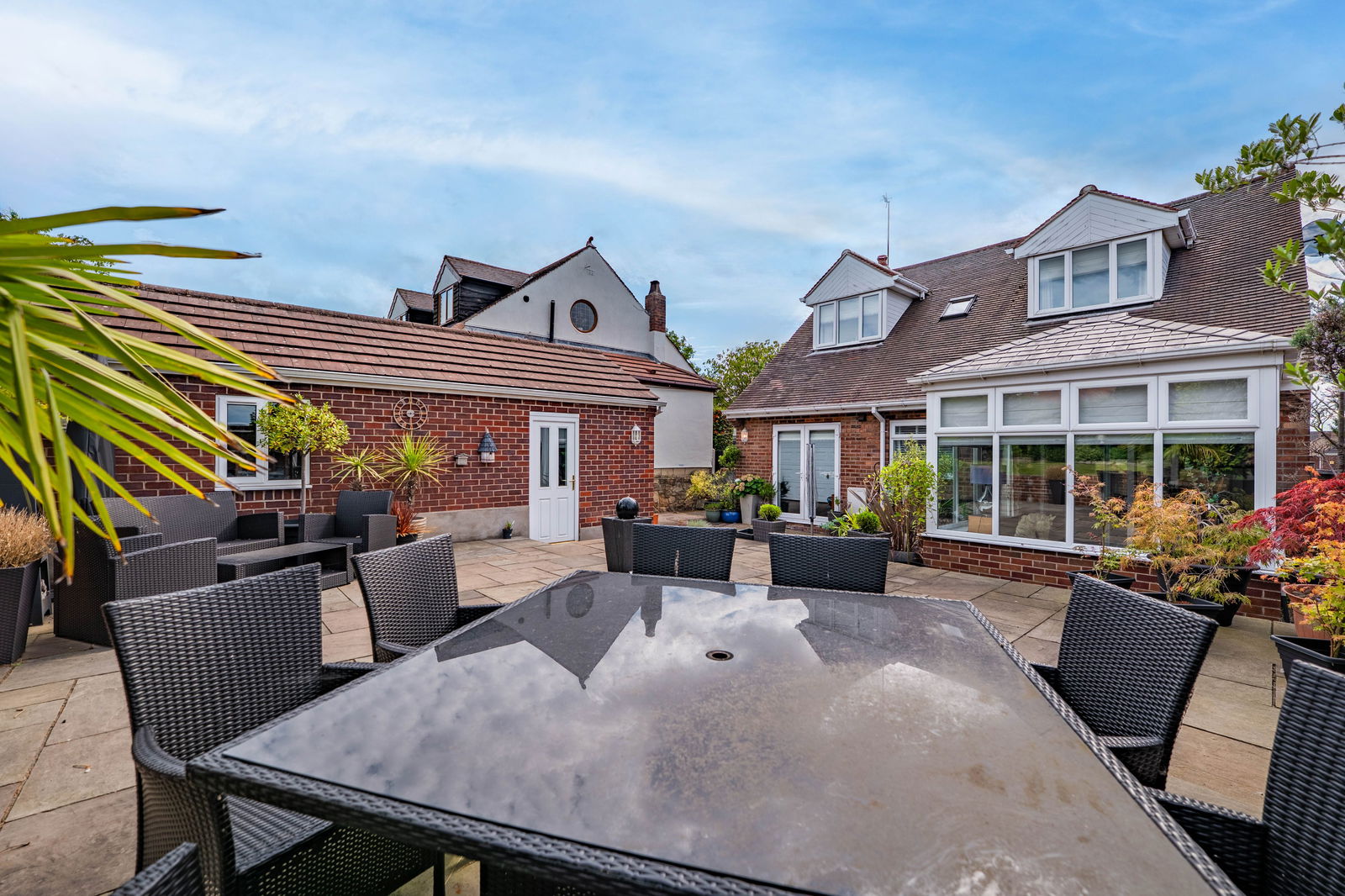 OUTSIDE, the home continues to impress with a LARGE SOUTH-FACING GARDEN including lawn, seating areas, summerhouse and established planting — perfect for relaxation or entertaining. To the front is AMPLE PARKING with a LONG DRIVEWAY and a DETACHED GARAGE with power and lighting.