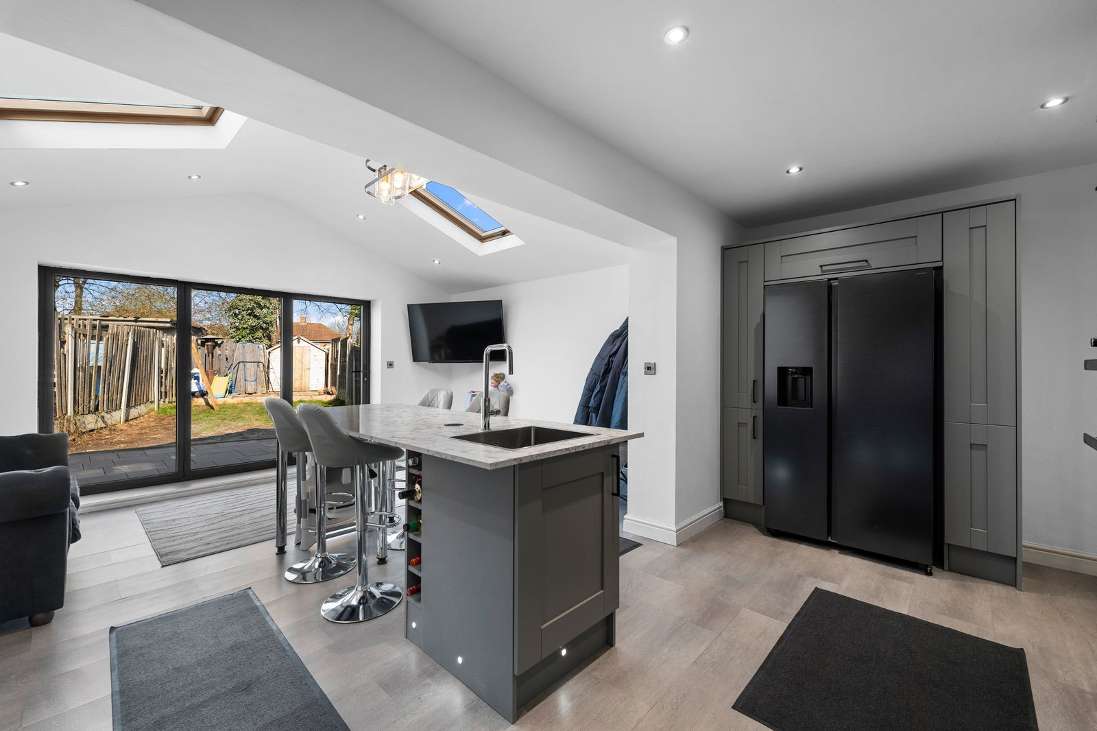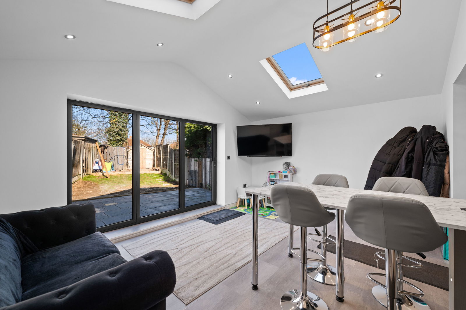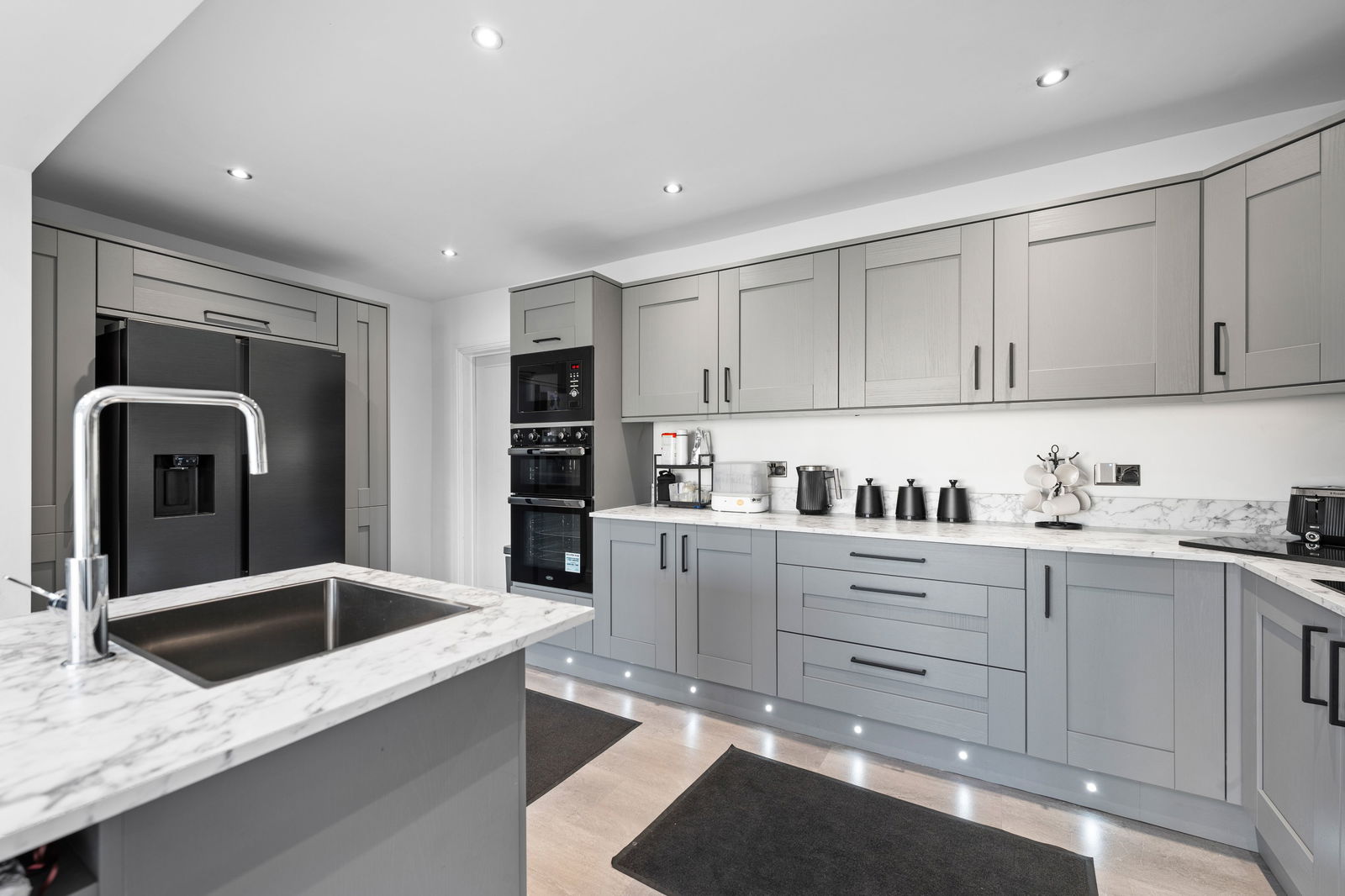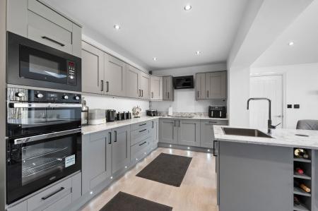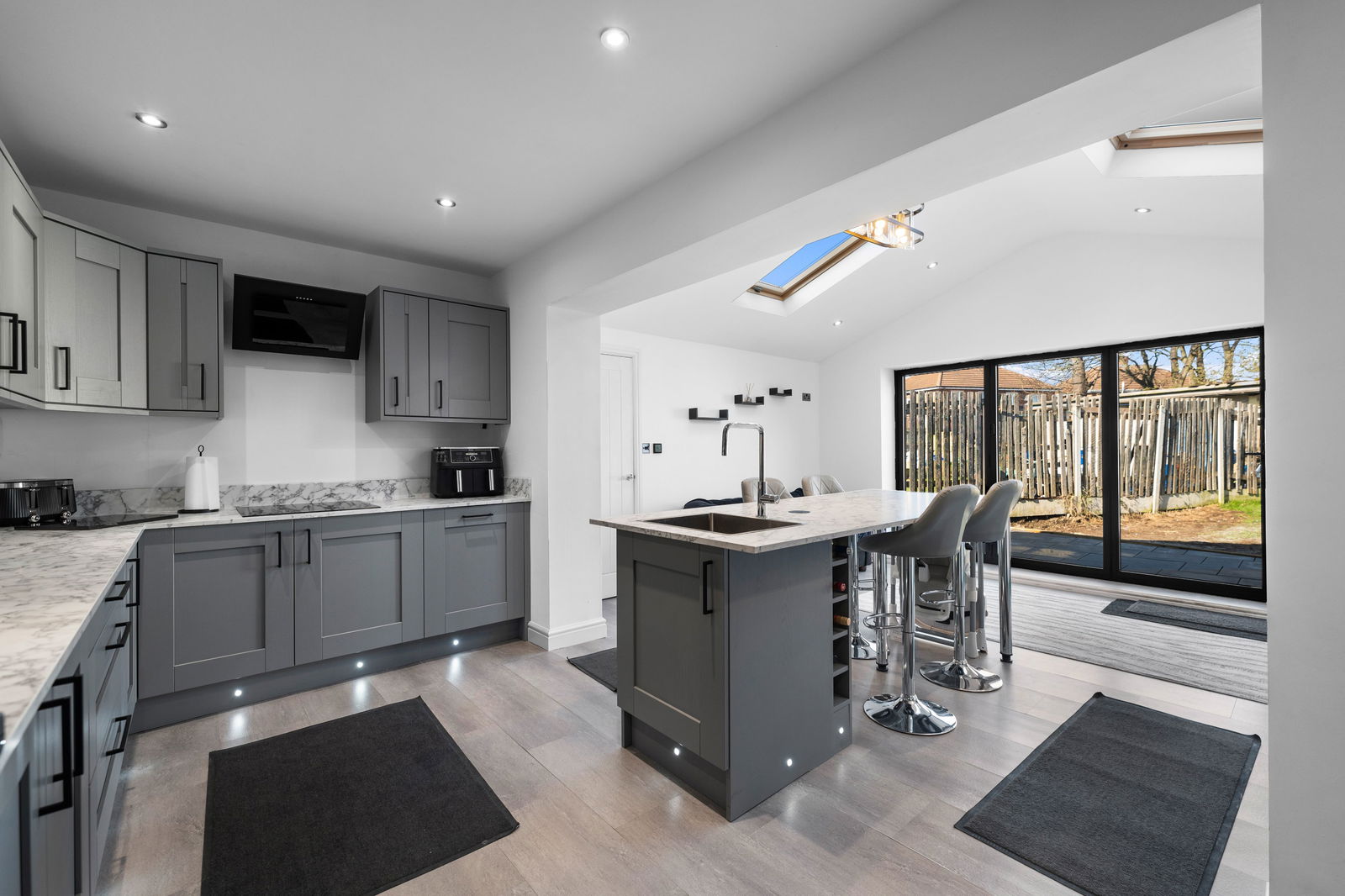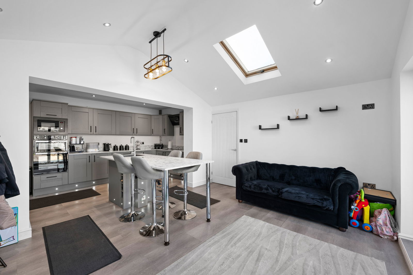 The standout feature is the IMPRESSIVE OPEN PLAN KITCHEN AND DINING AREA, finished to a great standard and opening out to the rear garden — perfect for both everyday living and entertaining. The ground floor also offers a comfortable LOUNGE, a convenient DOWNSTAIRS WC, and the added benefit of a LARGE GARAGE, providing excellent storage or further potential.