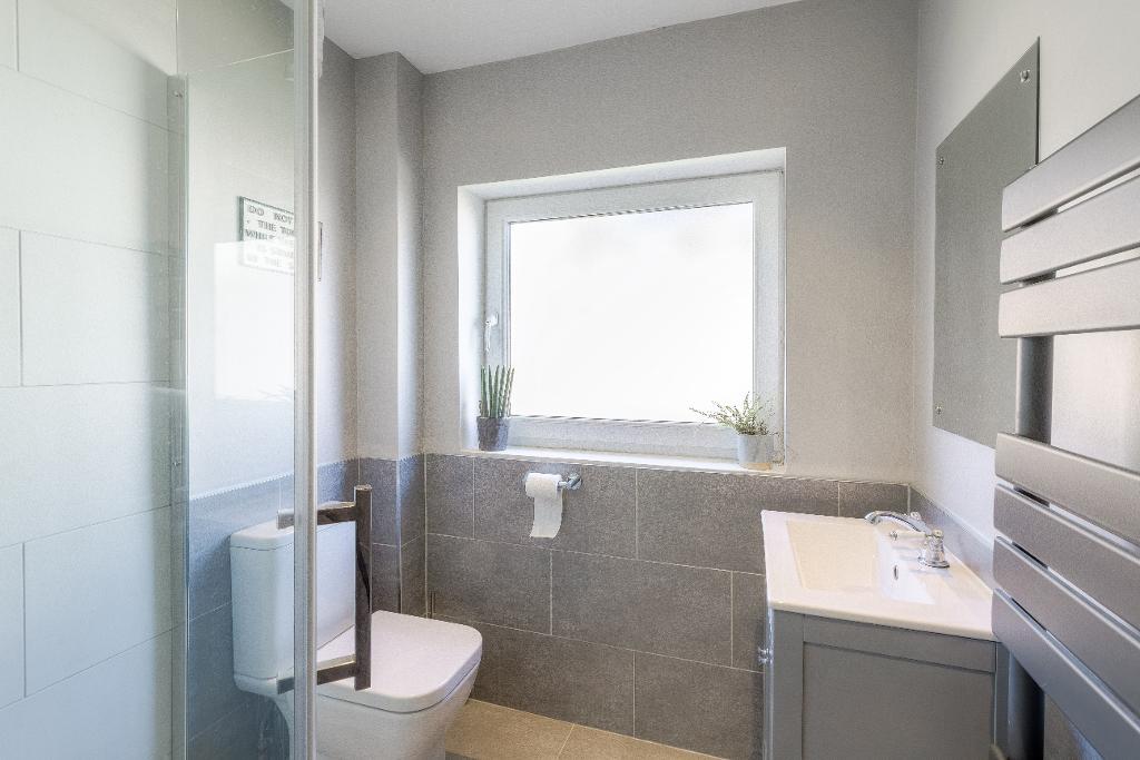 8' 1'' x 5' 10'' (2.48m x 1.8m) The shower room is fitted with a contemporary three-piece suite comprising a wash hand basin set within a vanity unit, WC, and a shower cubicle with a rainfall shower overhead. The space is complemented by a heated towel rail, stylish half-height tiling, and a double-glazed window to the rear, allowing for natural light and ventilation.