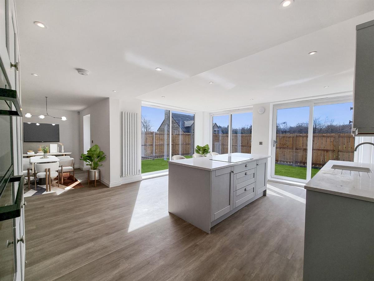As you step into the properties you will be impressed by their spacious design, high ceilings, contemporary finish and premium fixtures. The hallway provides access to a convenient cloakroom and downstairs WC, the lounge over looks the front of the property and provides a cosy space to relax. The wow factor of these properties is the inviting open plan kitchen diner family room that expands the width of the property. The floor to ceiling windows and patio doors fill the room with natural light and create a relaxing environment for everyday living. The kitchens are fitted with sleek shaker style units in pastel tones and Quartz worktops, integrated appliances include fridge/freezer, oven, microwave and hob. Breakfast bar seating is perfect for casual dining and there is a separate utility area for added convenience. Double doors provide access to the garden, ideal for extended entertaining during the summer months.