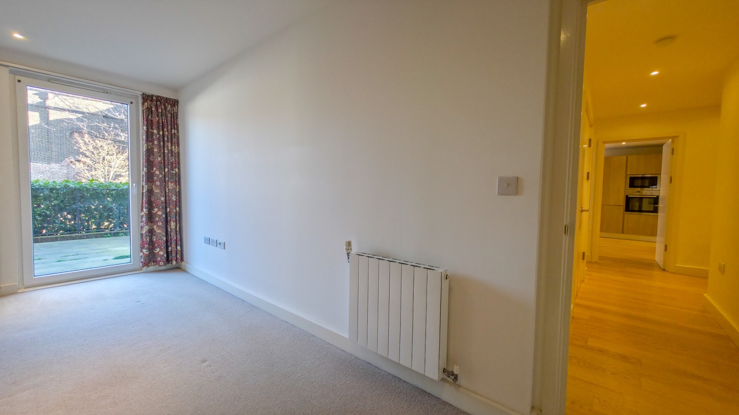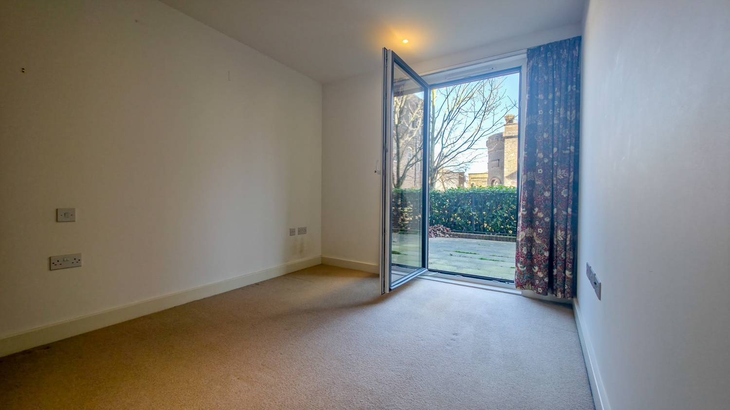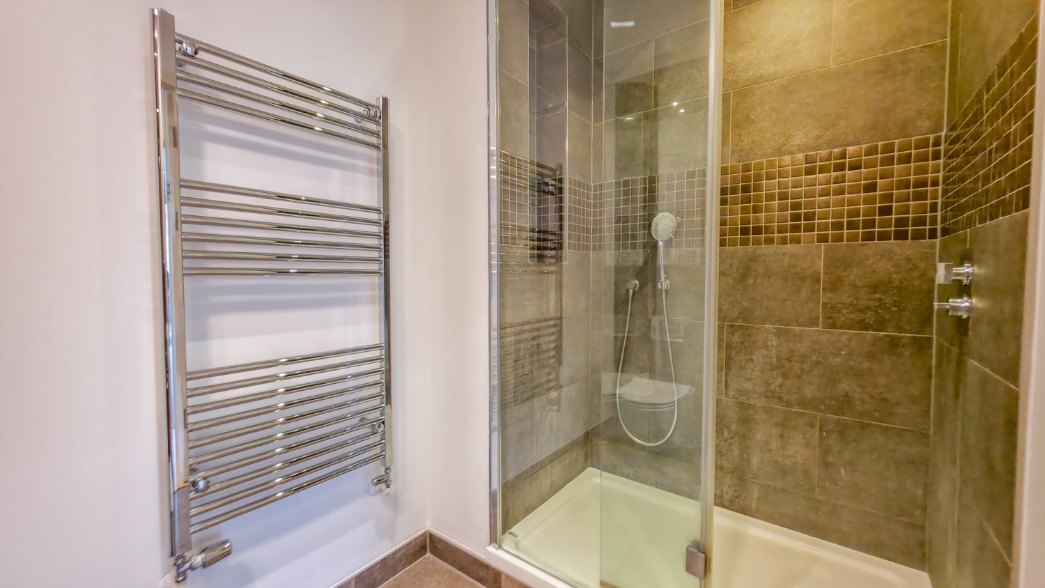 All three bedrooms are generous doubles, each benefiting from direct access to the terrace via full-height glazed doors, enhancing both light and space throughout. The principal bedroom features built-in wardrobes and a stylish en-suite bathroom, while a further modern shower room and two large storage cupboards provide additional comfort and practicality.