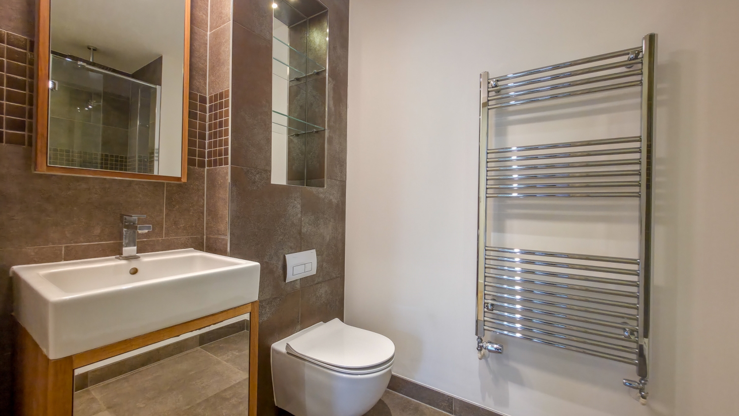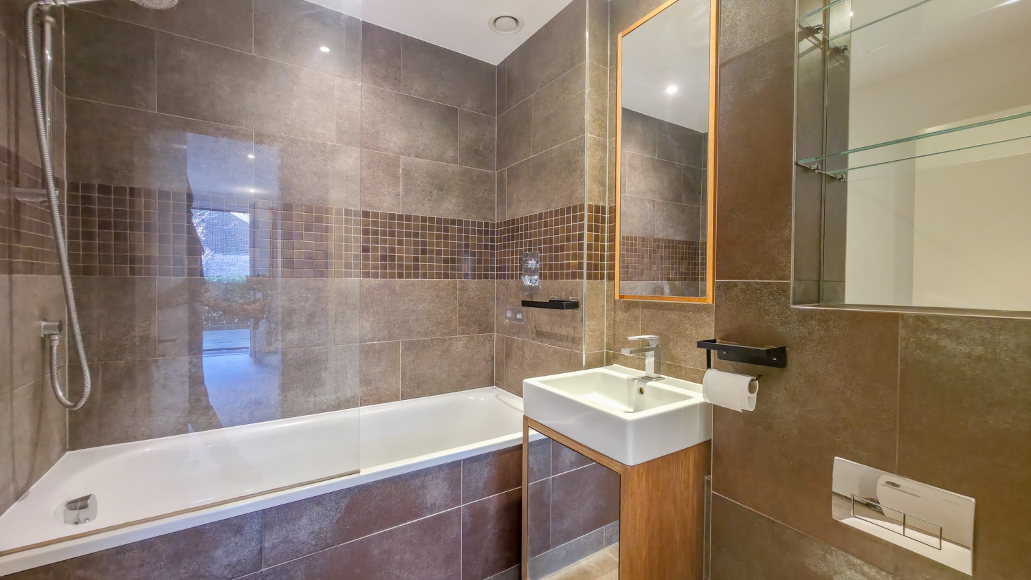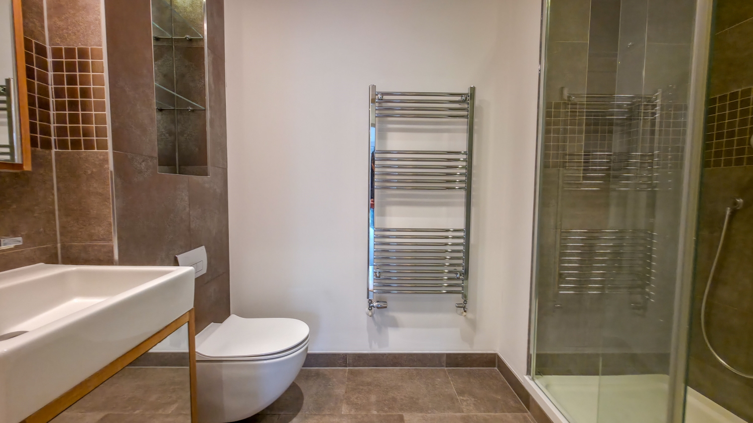 All three bedrooms are generous doubles, each benefiting from direct access to the terrace via full-height glazed doors, enhancing both light and space throughout. The principal bedroom features built-in wardrobes and a stylish en-suite bathroom, while a further modern shower room and two large storage cupboards provide additional comfort and practicality.