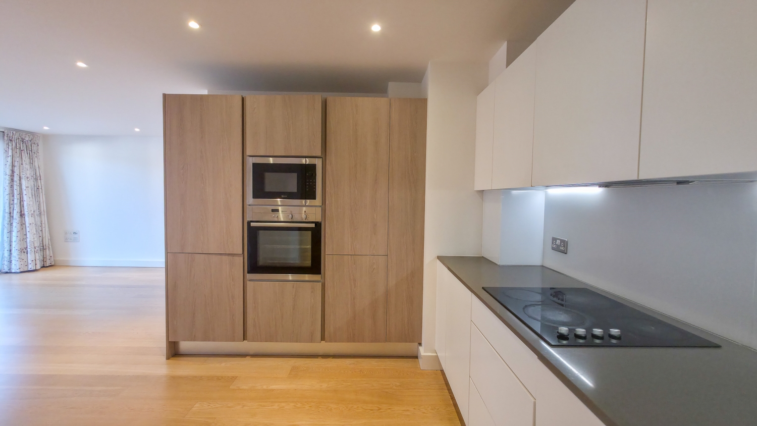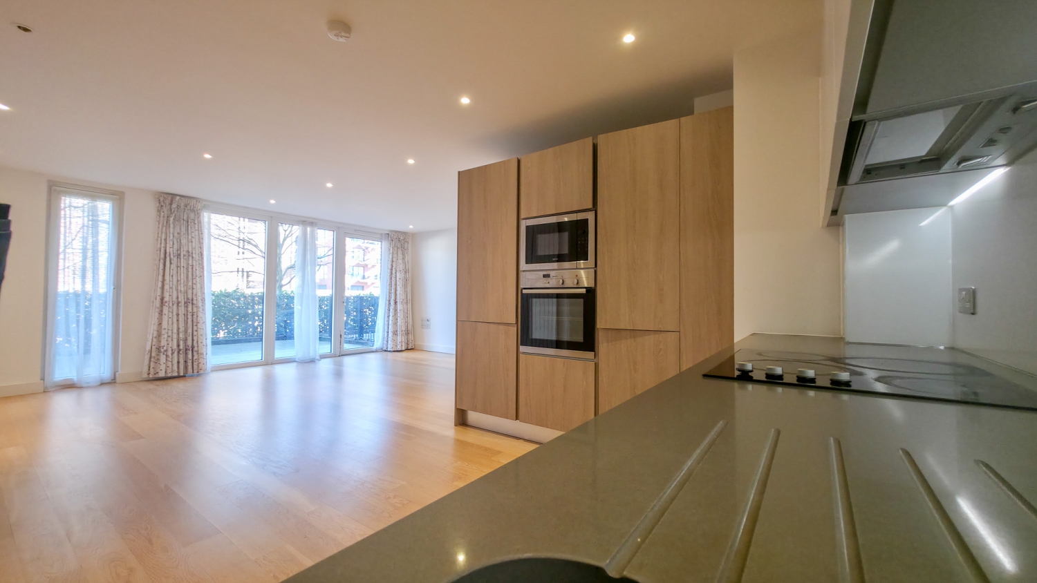 This impressive home offers outstanding modern living, centred around a stunning open-plan kitchen and living space. Floor-to-ceiling windows flood the room with natural light and open directly onto a large private wrap-around terrace, creating a seamless indoor-outdoor flow ideal for entertaining, dining, or simply relaxing. The contemporary kitchen is finished to a high specification with sleek cabinetry, integrated appliances, and clean, minimalist styling.