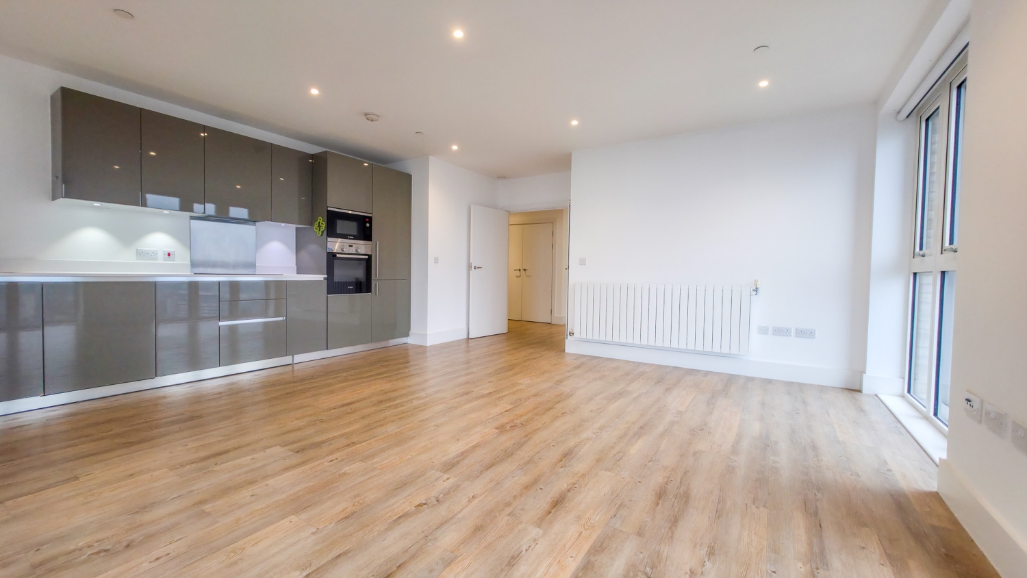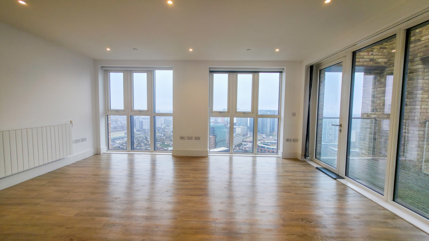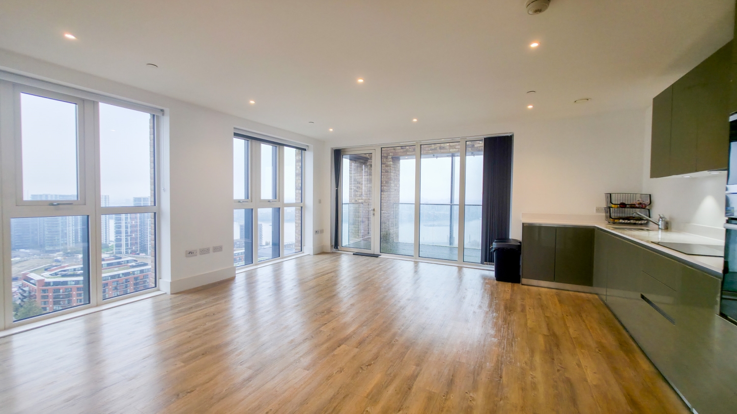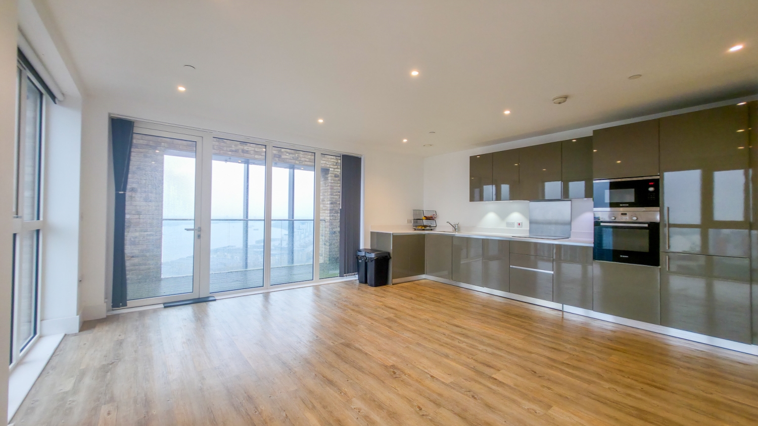 The apartment features three generously sized double bedrooms, including a stunning master suite with en-suite shower room, and a further high-spec family bathroom with a sleek, contemporary finish. The spacious open-plan living and dining area is bathed in natural light thanks to floor-to-ceiling windows, and flows seamlessly into the modern integrated kitchen, complete with high-end appliances and stylish fittings.