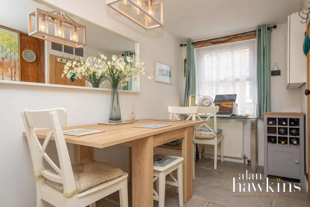 Once two separate cottages, the property has been thoughtfully combined to create a deceptively generous home featuring a comfortable living room, a walk-through dining room, and a well-proportioned kitchen complete with Quartz worktops, Integrated slimline dishwasher, integrated double oven & hob and French doors opening onto a neat, enclosed rear courtyard with views of the church beyond. A large cellar is accessed from the dining room, offering excellent storage space.