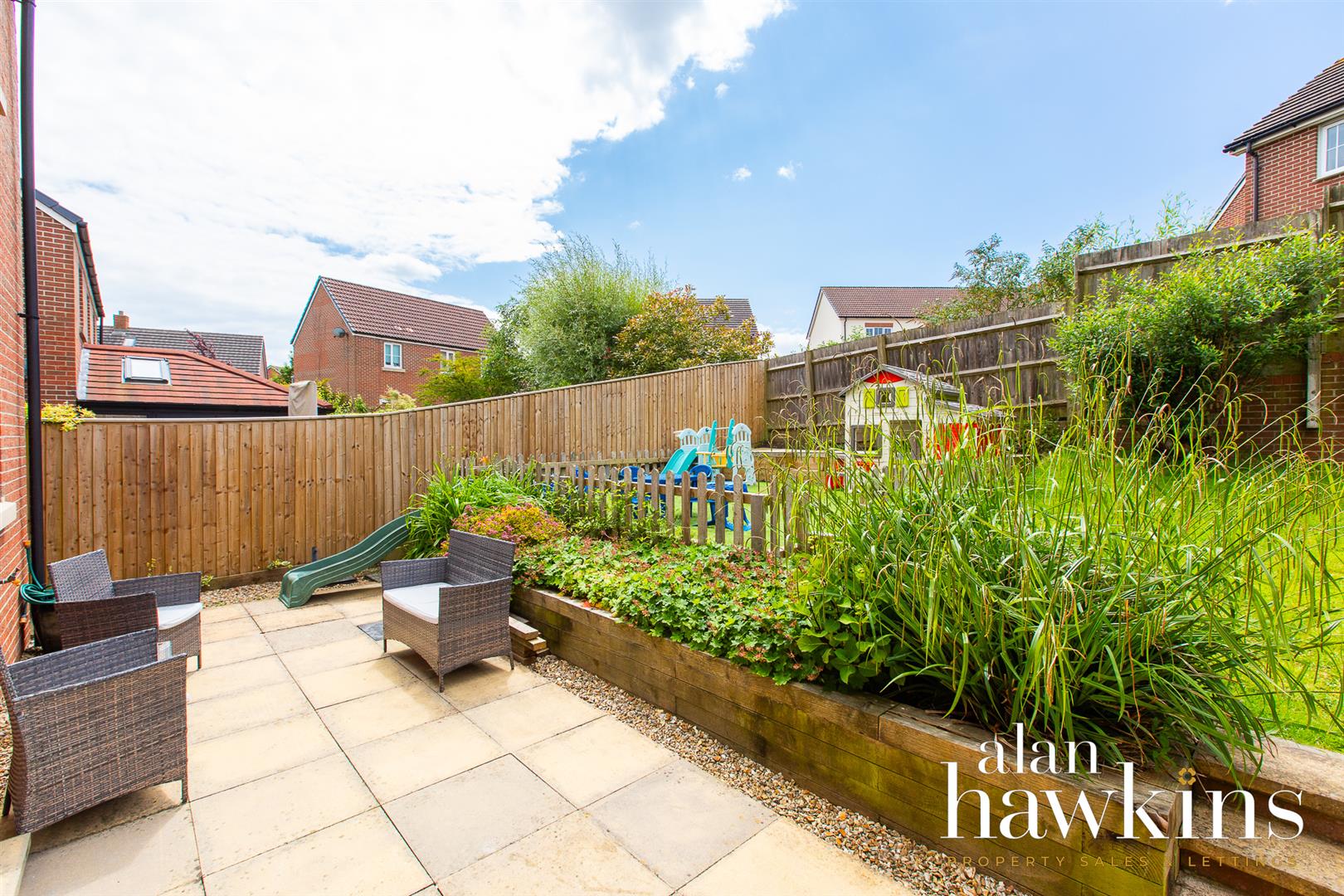 The rear garden is well-proportioned and thoughtfully designed, featuring a patio with pergola, a lawned area, and a separate artificial grass play area-perfect for children or low-maintenance enjoyment. To the front, the home benefits from a neat lawned garden and a double-width driveway providing off-road parking for two vehicles.