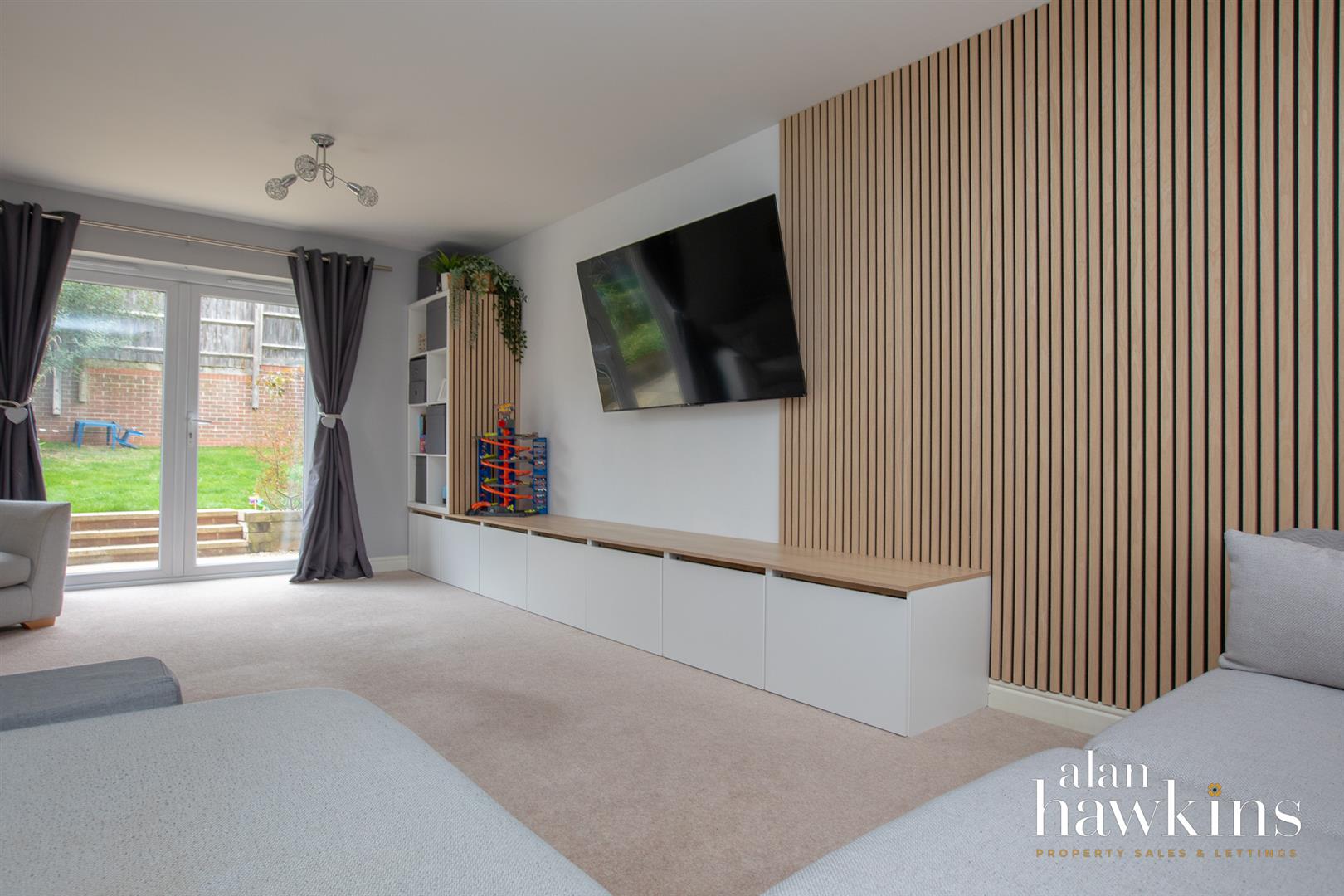 The property offers an entrance porch with cloakroom and storage, leading into a spacious and light-filled kitchen/dining/family room with bespoke under-stair built-in storage. There is lovely range of kitchen units and a rear lobby/utility room. The lovely dual aspect living room is accessed from the kitchen and features uPVC French Doors to the rear garden.
