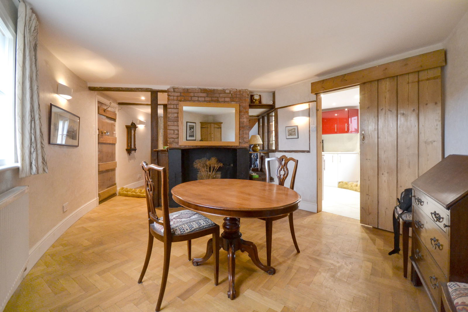 In detail the property comprises a welcoming sitting room, complete with a wood-burning stove set within an exposed brick fireplace, parquet flooring, and original timber features. The kitchen, situated to the rear is fitted with a matching range of eye and base level units with space and plumbing for appliances. The wonderful dining room enjoys views to the front and parquet flooring.