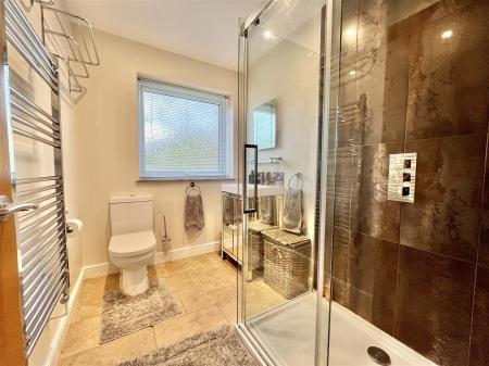 Shower Room - 2.46m x 1.75m (8'01 x 5'09) - Walk-in shower cubicle with overhead rainfall shower and tiled surround, close coupled w.c, vanity handbasin with tiled splashbacks, heated towel rail, window to side aspect.