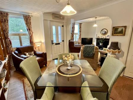 Dining Room - 4.27m x 3.43m (14'0" x 11'3") - Built in storage and display units, wood effect flooring, window with fitted slatted blinds to the front aspect. An archway opening leads to the adjacent sitting room, doors lead off to the kitchen and bathroom.